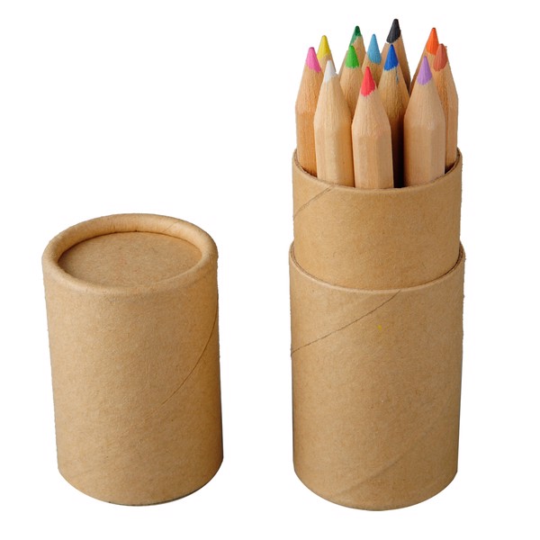 12 wooden crayon set in cardboard tube. Crayon length:8,5 cm. Environmentally safe manufacturing process.