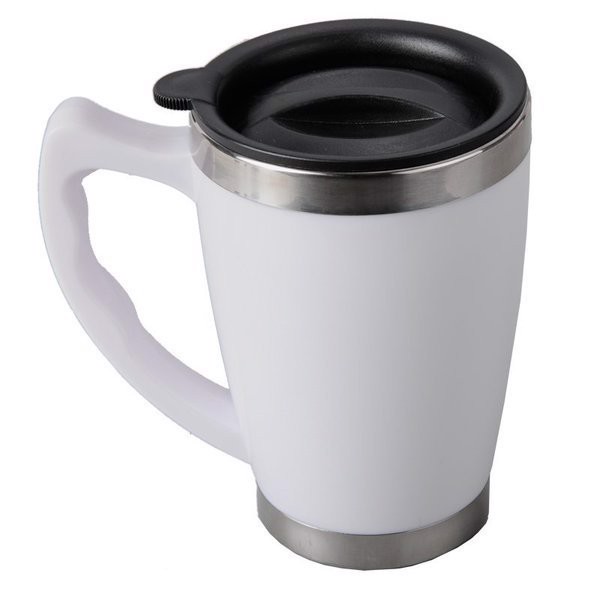 380 ml thermal mug with lid made from stainless steel and plastic. Packed in white cardboard box. Inside upgraded 18/8 stainless steel. Shift-close lid. Hand wash only. It keeps temperature upwards 40 degrees for 2 hrs. XL print option possible.