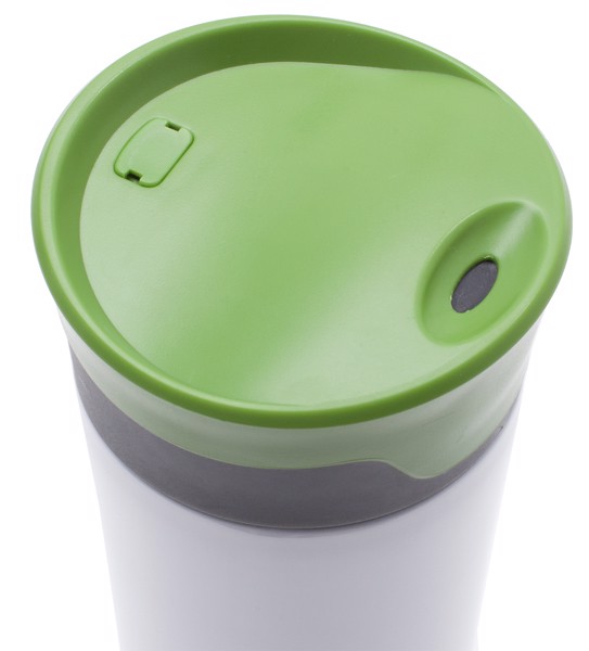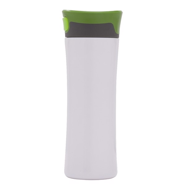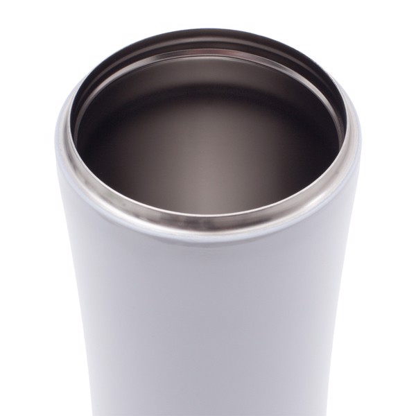 Leakproof 430 ml stainless steel thermal mug and insulated mug rolled in one. 2 stainless steel walls with the inner one made from upgraded 18/8 steel and vacuum in between them assures splendid thermal insulation. Stop-go lid. Hand wash only. It keeps temperature upwards 40 degrees Celsius for 9 hours.