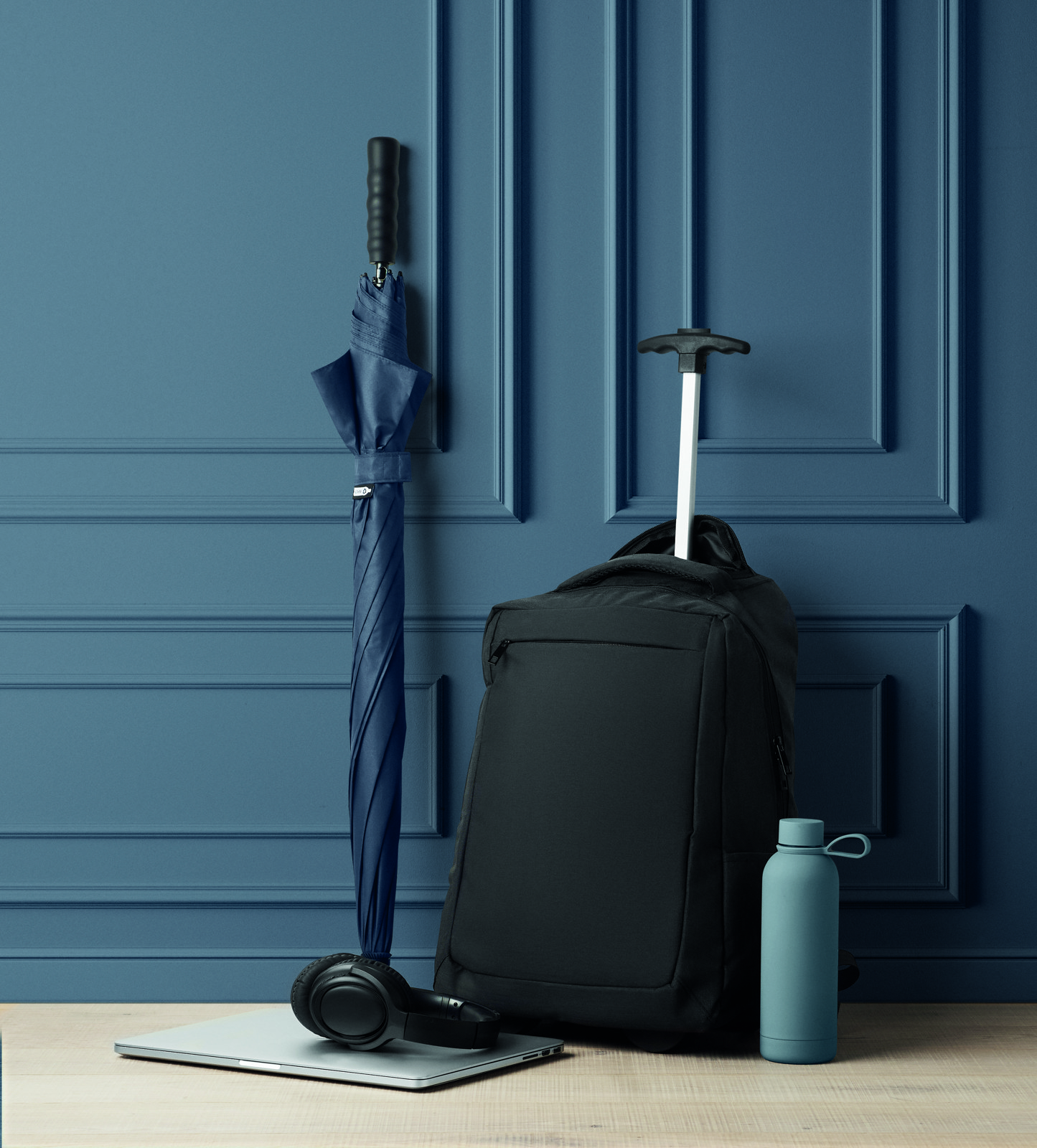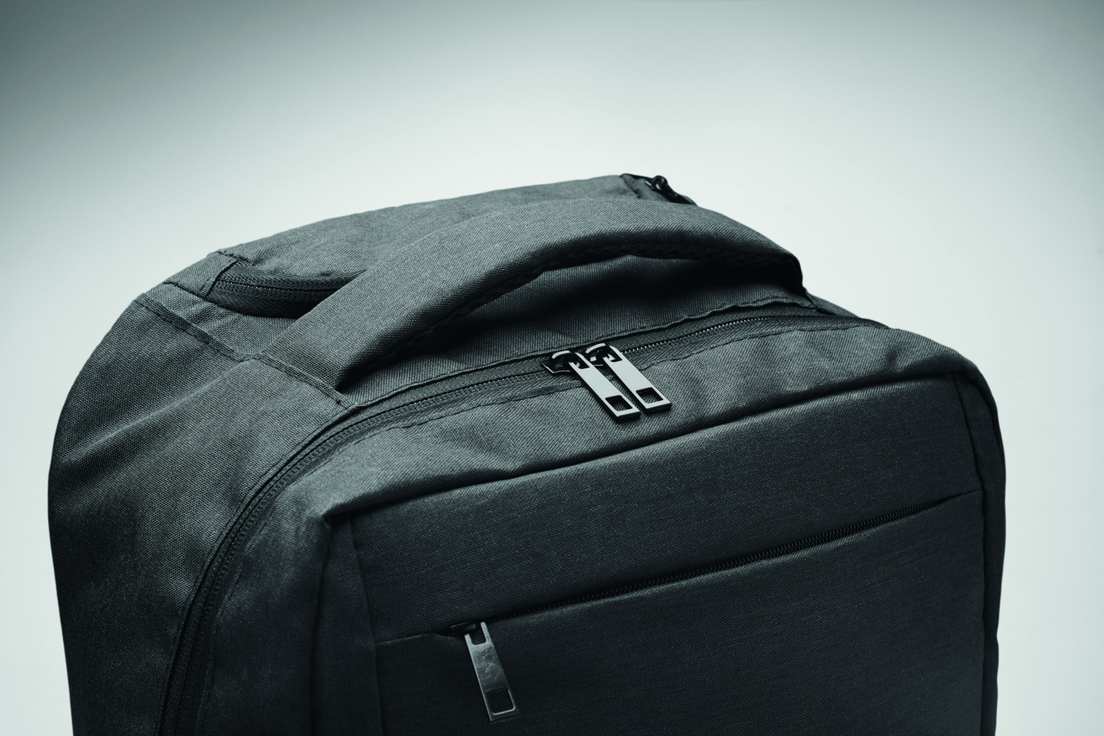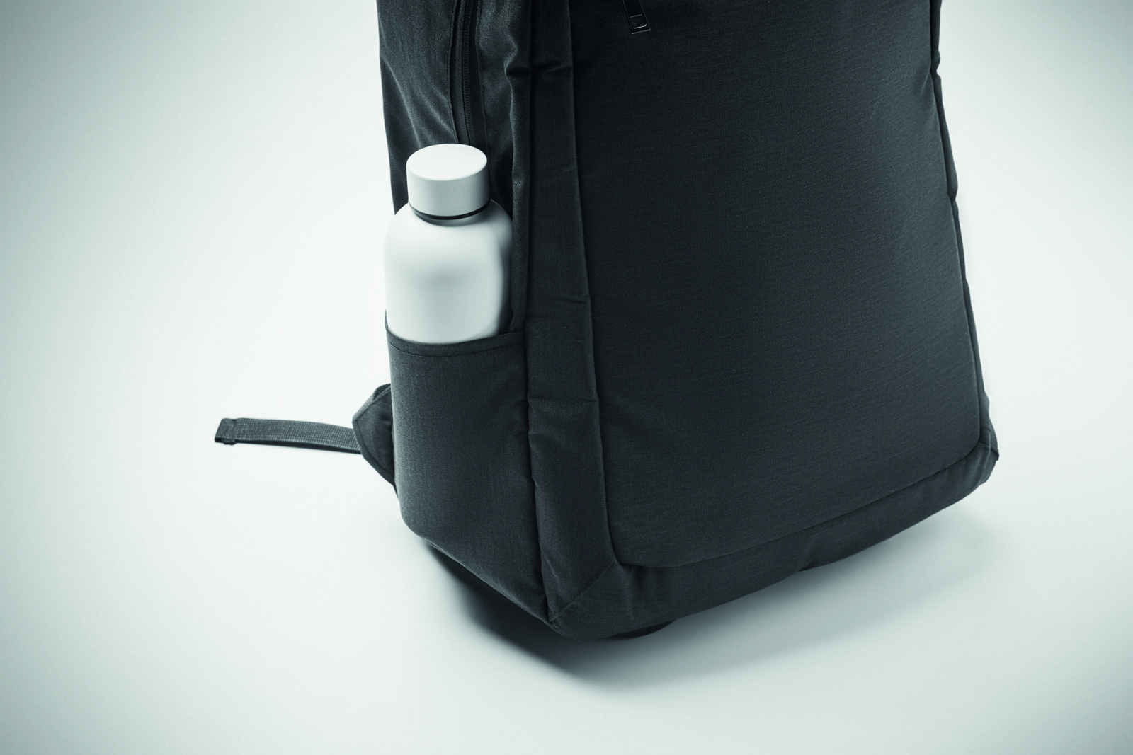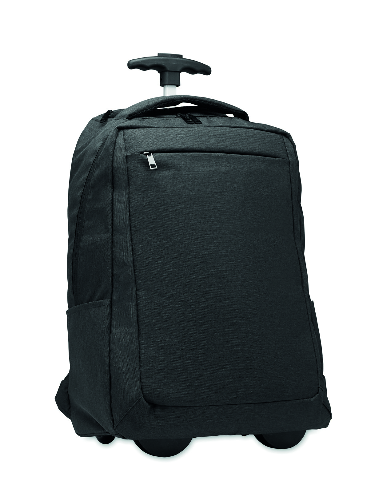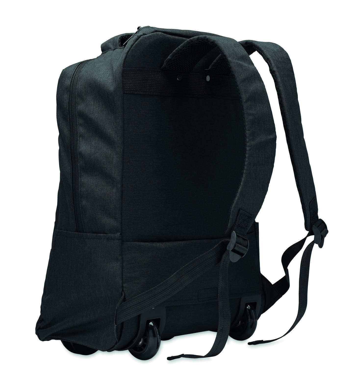 Laptop backpack trolley with wheels in 600D RPET polyester. Includes one internal 15 inch laptop compartment. Zippered front pocket. Two side slip pockets. Three inner slip pockets. Padded back and shoulder straps. 2 wheels and double tube frame.