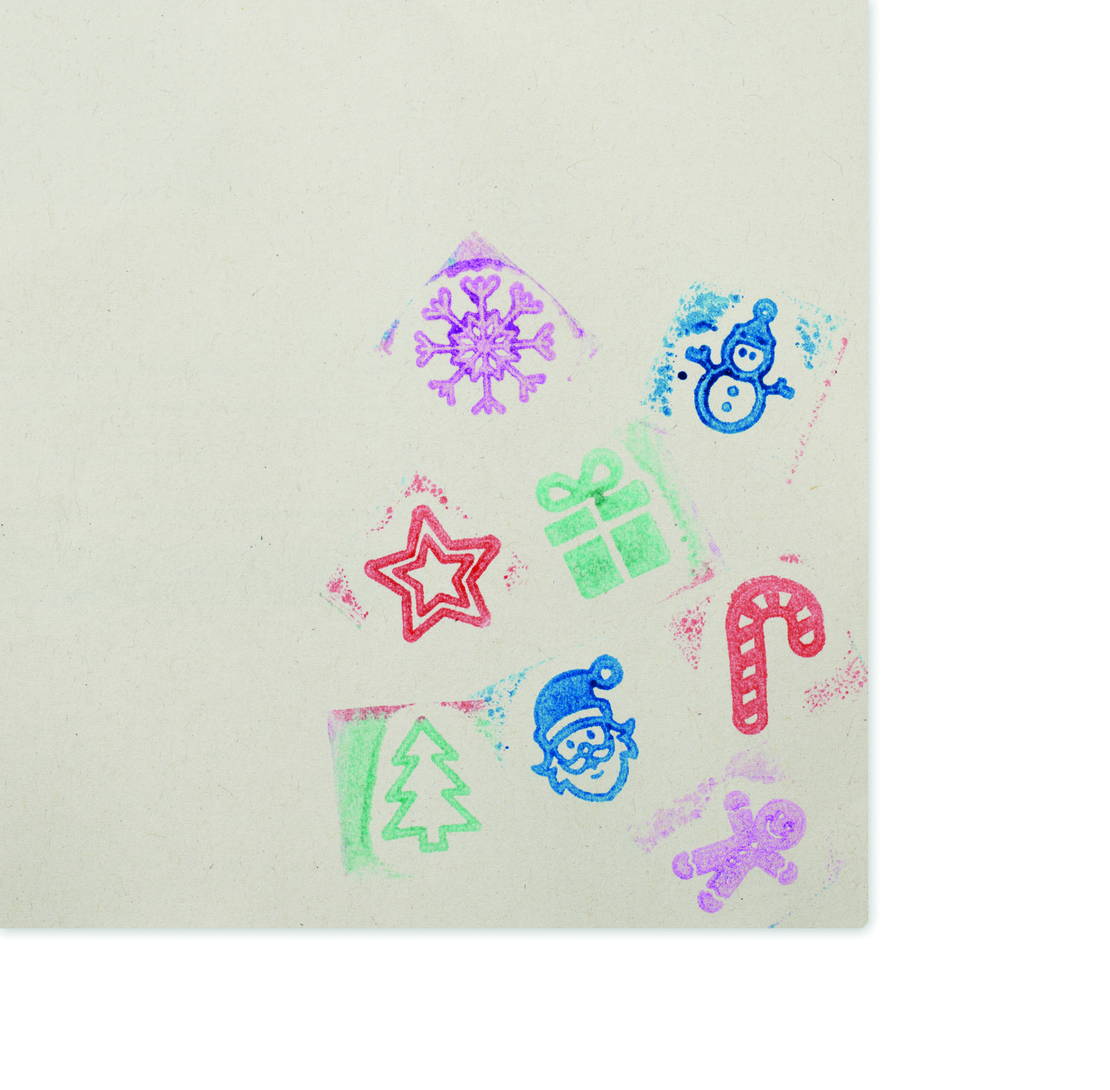 Set of 8 wooden Christmas stamps and multicoloured stamp inkpad with 4 different colours. Presented in a cotton drawcord bag.