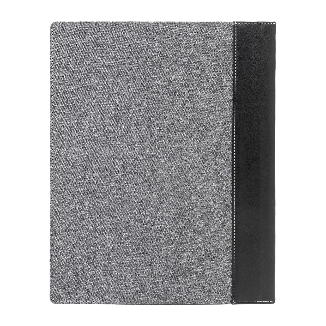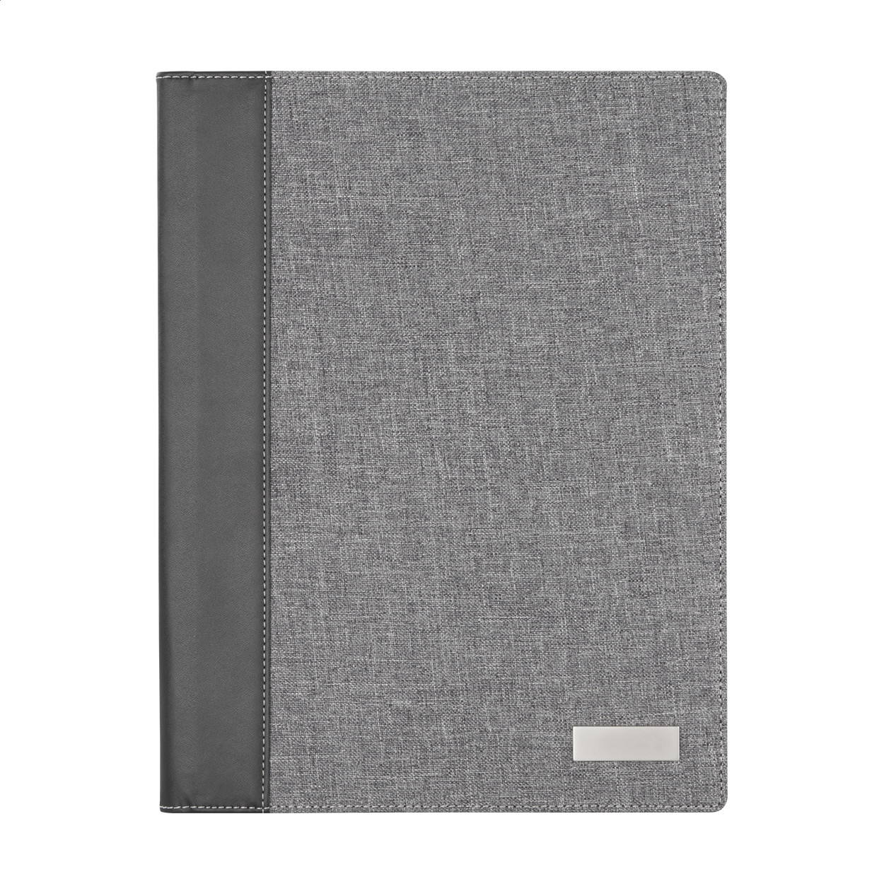 Linen and PU leather covered, A4 sized document folder with 20 lined sheets notepad and metal plate.