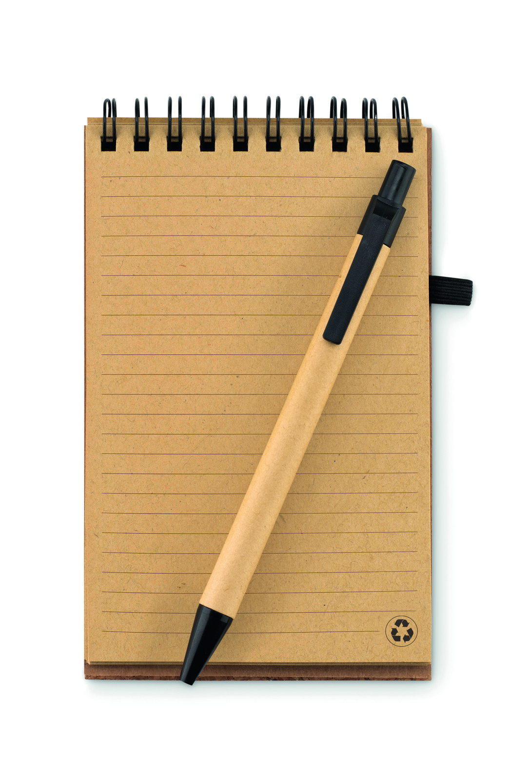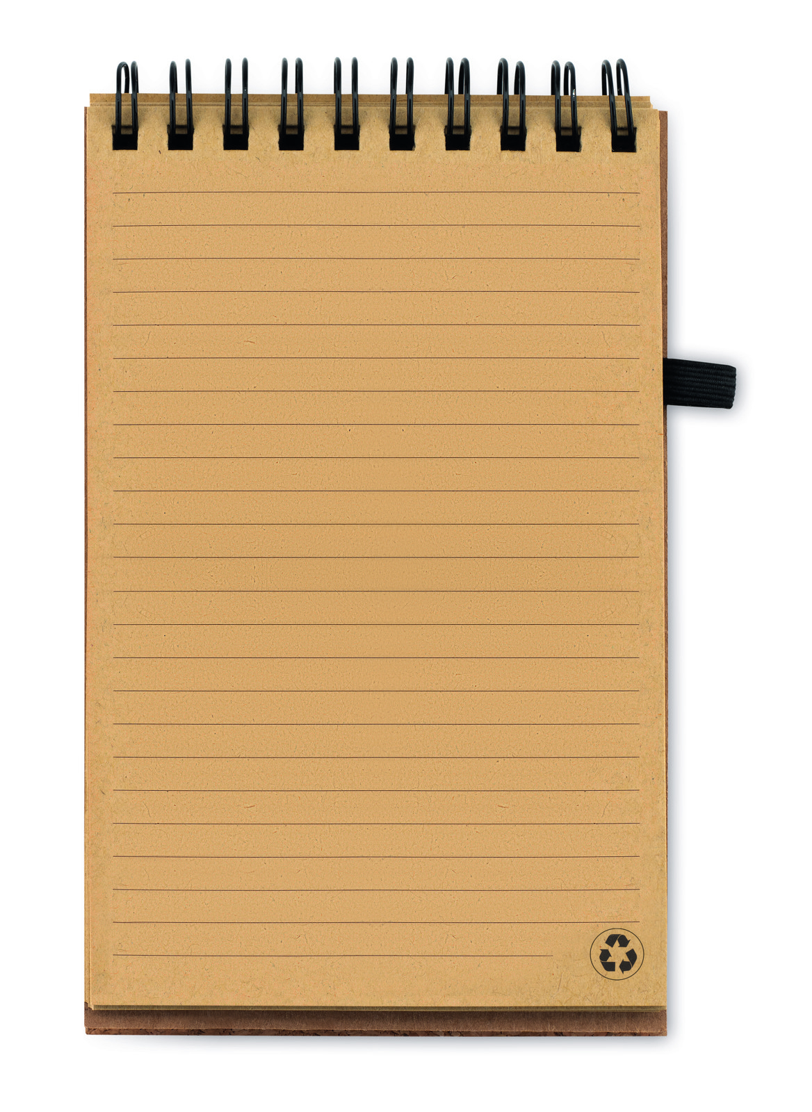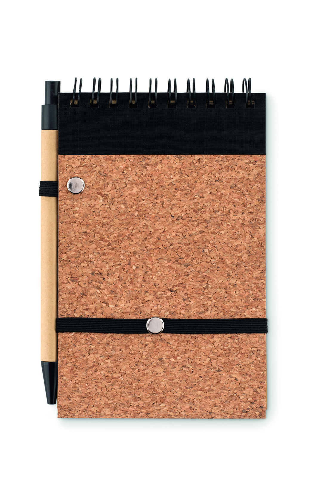 A6 notepad with cork cover. Twin-wire. 70 lined recyced paper sheets. Matching push button ball pen with recycled carton barrel and corn PLA details. Black ink. Elastic closure strap and pen holder. Cork is 100% natural material. Due to its structural nature and surface porosity the final print result per item may have deviations.