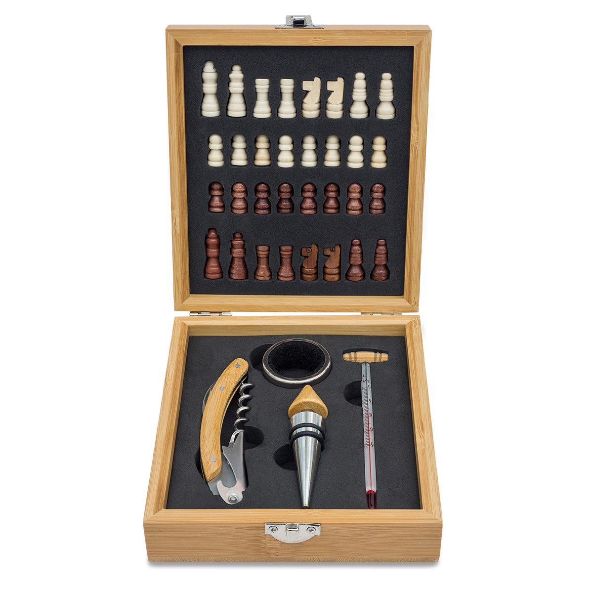 Bamboo set consisting of chess and wine accessories, which include: wine corkscrew opener, bottle drip collar, stopper and thermometer.