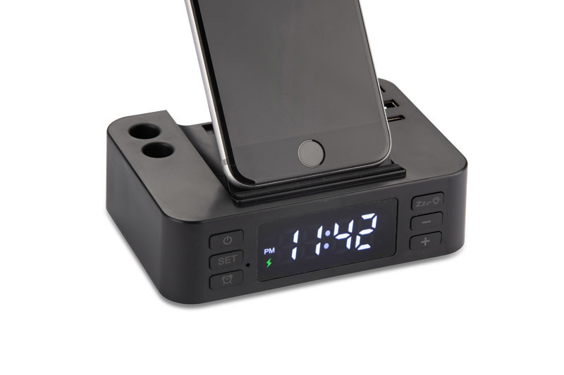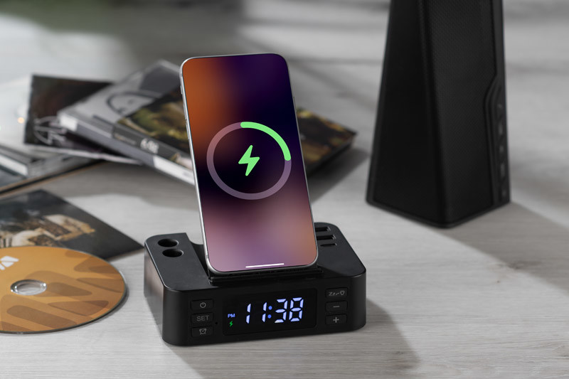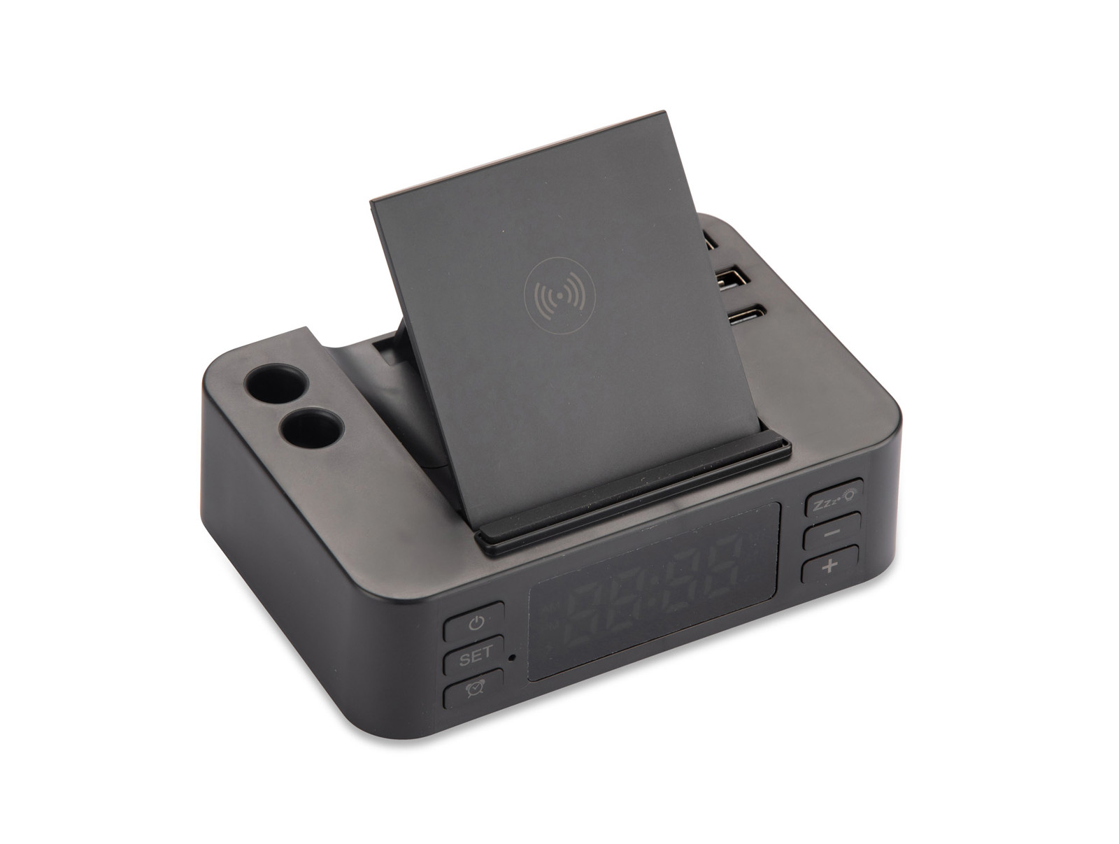 The CLOCKI alarm clock with wireless charger is a practical promotional gadget that is perfect for a desk or nightstand. It features three USB ports (USB, USB, USB-C) and a wireless charging pad. You can charge your phone both horizontally and vertically with the help of the foldable stand. Additionally, the clock has two compartments for pens or other small items. The set includes a USB-C cable, making it a complete solution for everyday use.