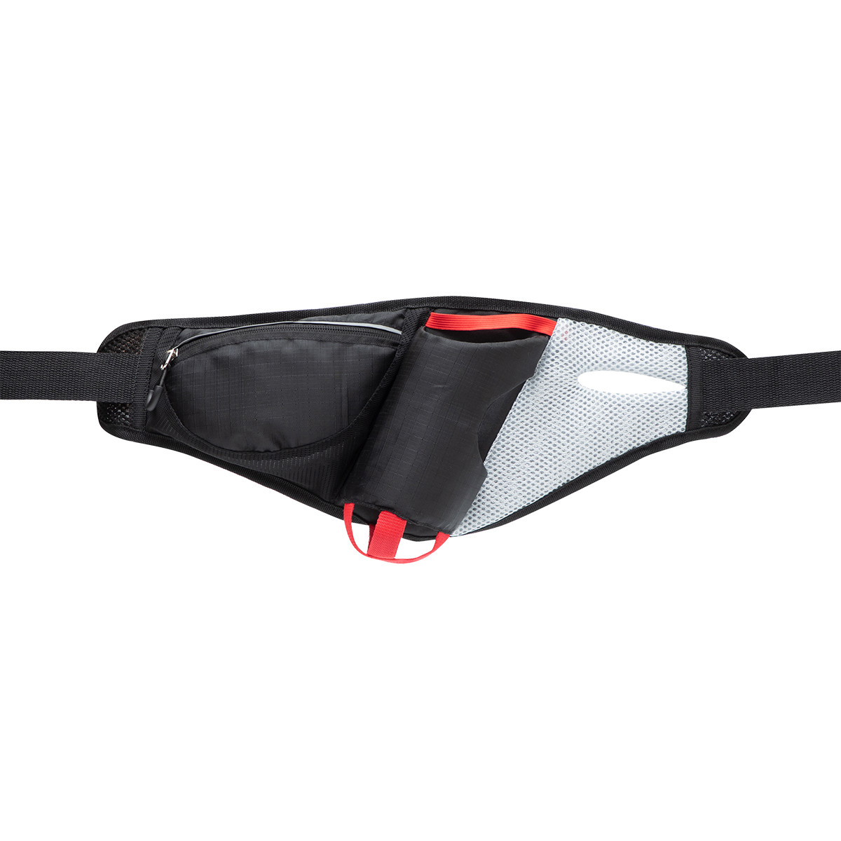 A sport waistband which allows you to carry everything you need for hiking, running or walking. Equipped with a special stiffened bottle holder and a zipped pocket for snacks and telephone. Comes with a carabiner, adjustable belt and reflective strip. The inside is covered with an elastic, soft mesh which provides comfort and ventilation.