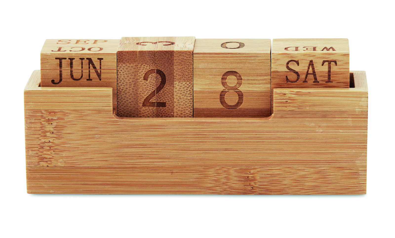 Bamboo block perpetual desktop calendar. Bamboo is a natural product, there may be slight variations in colour and size per item, which can affect the final decoration outcome.