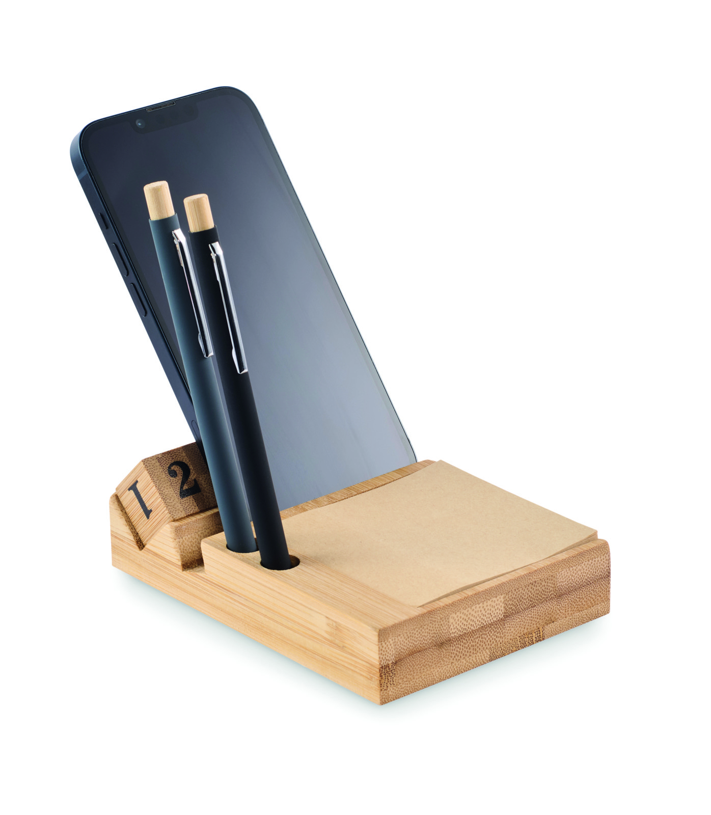 Bamboo desktop calendar with phone holder functionality, 2 pen holders and 50 sticky note sheets. FSC®-certified | FSC 100%, N5.7, FSC-C213206.