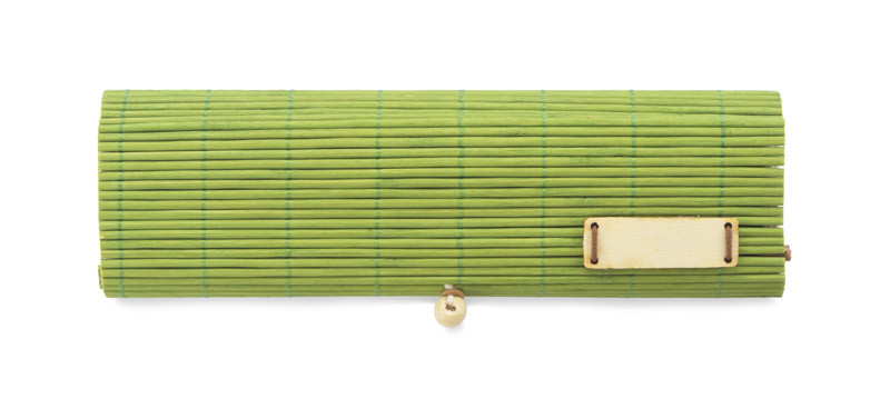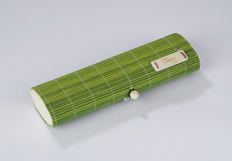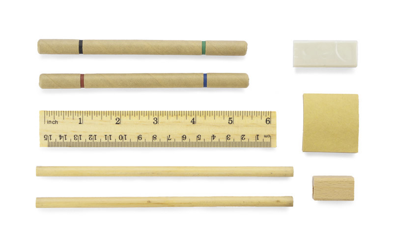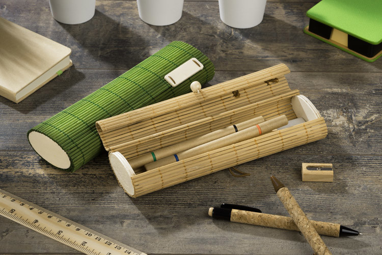 Eco bamboo pencil-box with accessories. Includes: two-sided pens (red, blue, green, black), two pencils, ruller, pencil sharpener, rubber and memo stick. Ecological style, interesting design and usefull features combined in one product.
