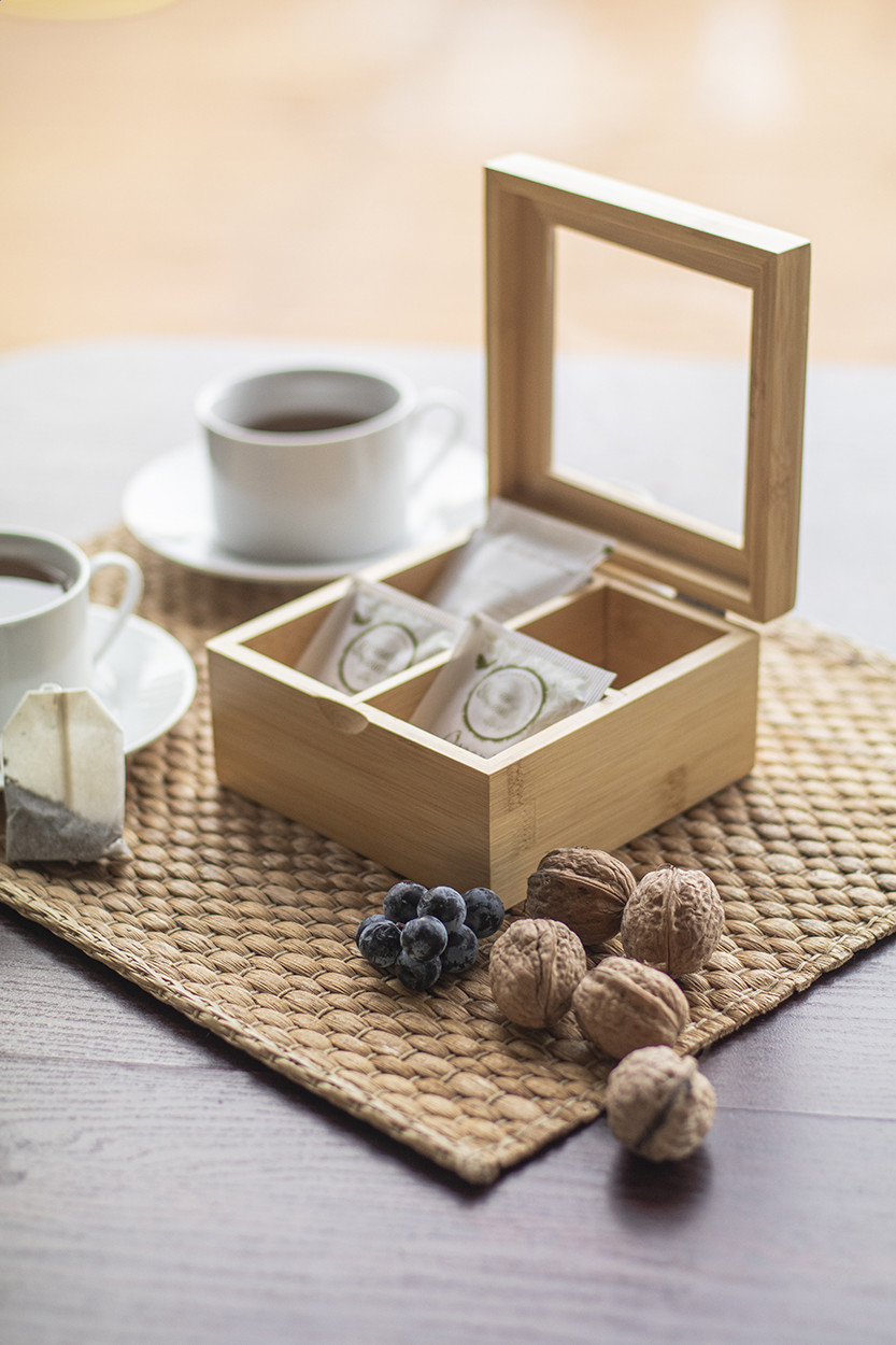 Bamboo tea storage box with transparent acrylic lid and 4 compartments.