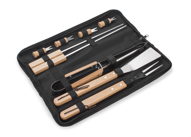 PANO is a 9-piece grill set in a practical zipped case, with an adjustable strap for comfortable carrying. The set is composed of a food turner, fork, tongs, skewers (2 pcs.) and corn holders (4 pcs.). The holders of all parts are made of wood.
