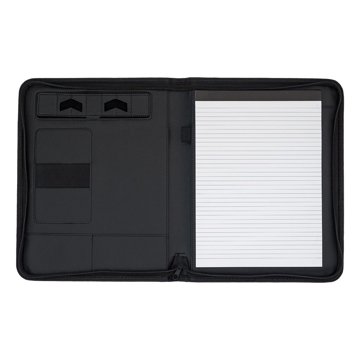 An elegant A4 folder made of eco-leather, closed with a zipper. It includes a notebook, two small pockets, a flexible phone holder and a foldable phone stand. The briefcase also has a pen loop.
