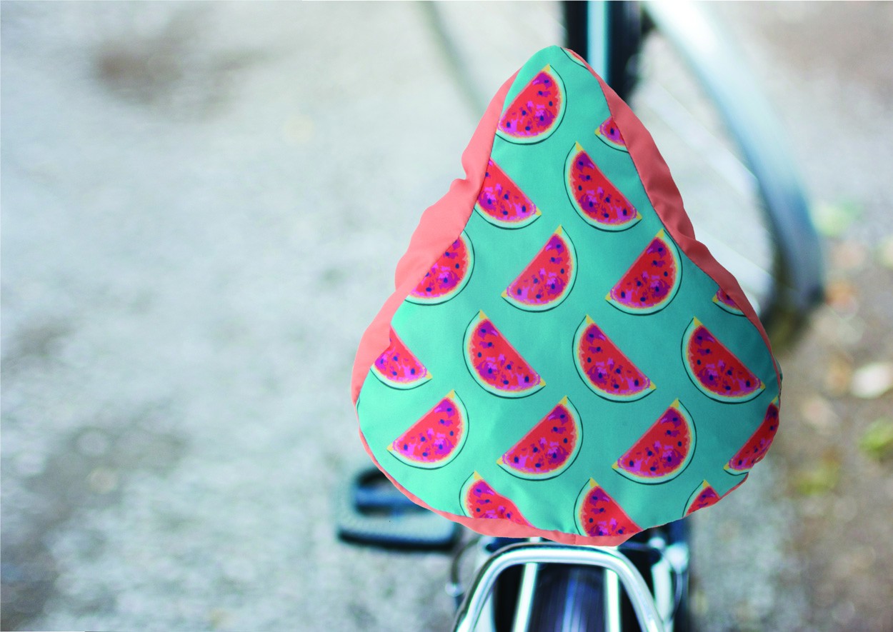 Custom made, full colour printed bicycle seat cover with elastic band, water repellent 190T polyester. Price includes sublimation printing. MOQ: 50 pcs.