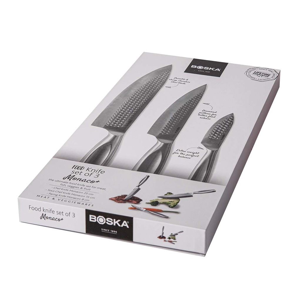 The Monaco+ kitchen knives set, from the brand BOSKA – a B Corporation certified company – is the ultimate set for every food lover. With the same features as the knives for professionals; high-quality stainless steel, extra sharp, and the slender handle for full control of the knife. Cooking Knife - for cutting everything! Sous Chef Knife – because what is a Chef without a Sous Chef. Paring Knife - for cutting vegetables and fruit. This set is handwash only, and backed by a lifetime guarantee.