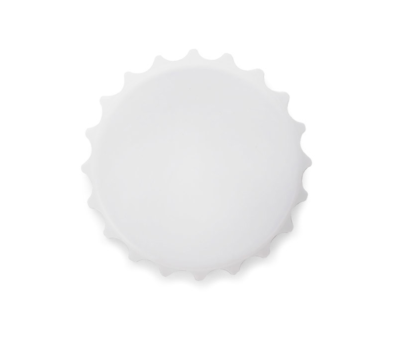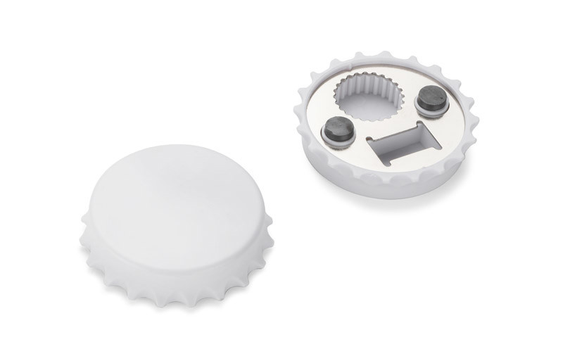 Bottle cap shaped opener . It has built in magnet that enables attaching this handy gadget to refrigerator. Logo may be inprinted on products' surface.
