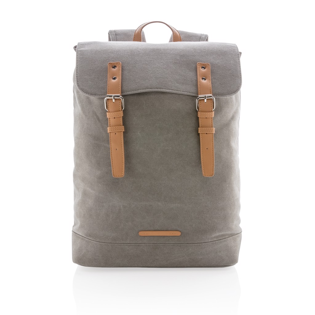 Carry your essentials for casual travel in this durable canvas backpack. This model features a padded section for your laptop up to 15.6". The top flap closes with two imitation leather magnetic buckles. PVC free.
