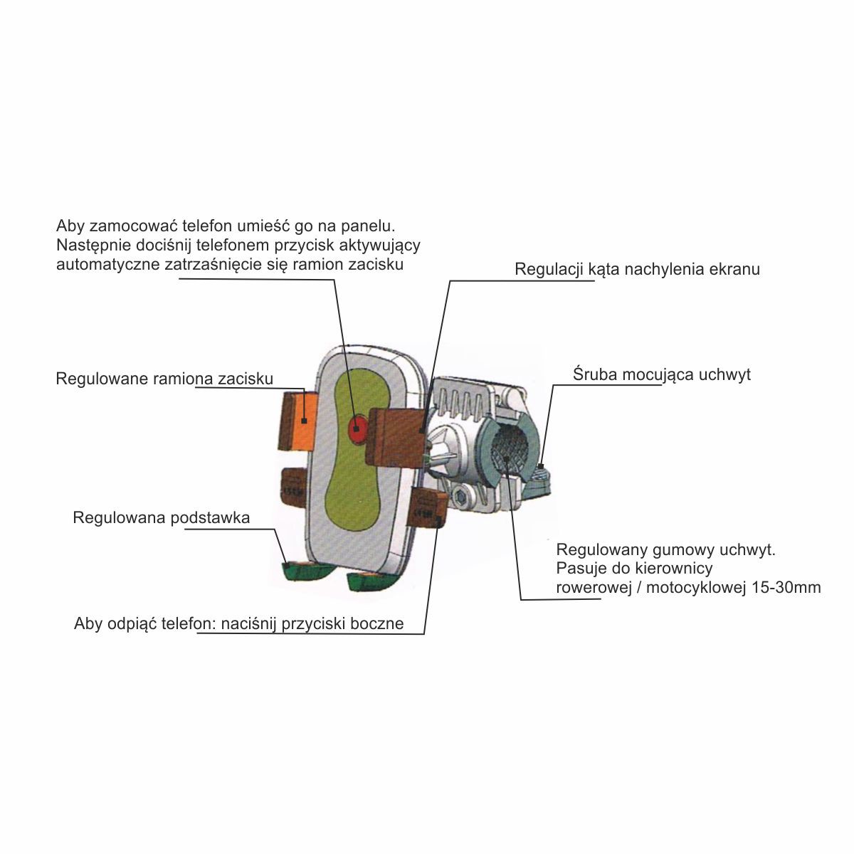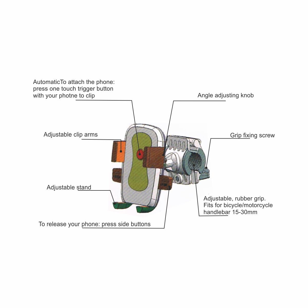 Mobile phone holder for bike. It's suitable for 5.5 - 8.5 cm wide mobiles. Angle adjusting possibility. The clamping mechanism makes it possible to attach and remove your phone from the handle using one hand only.