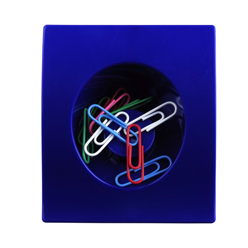 Paper clip holder made from solid color plastic. It comes with 10 clips.