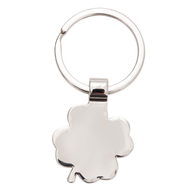 Clover-shaped metal keyring. Packed in black cardboard box.