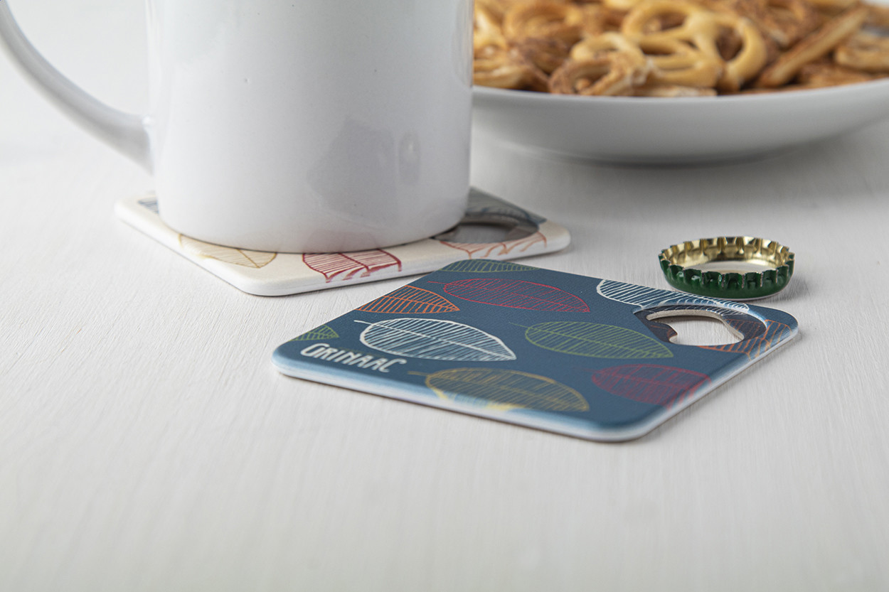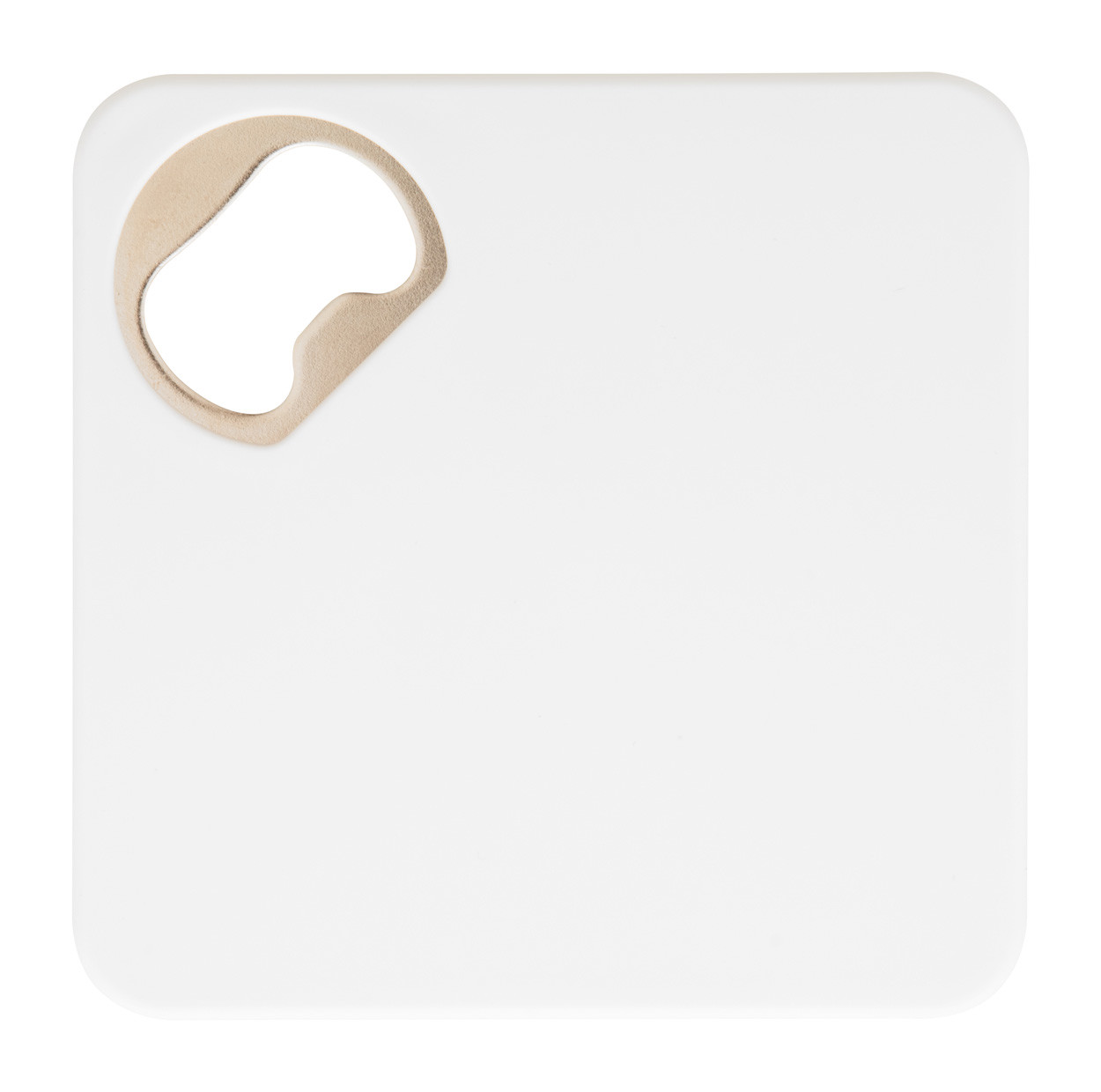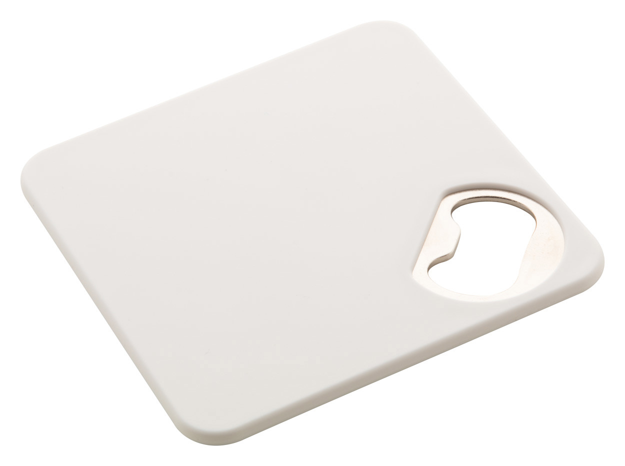 Plastic coaster with metal bottle opener and non-slip bottom.
