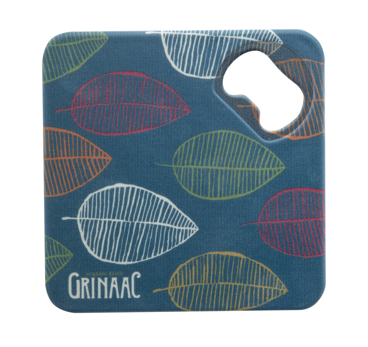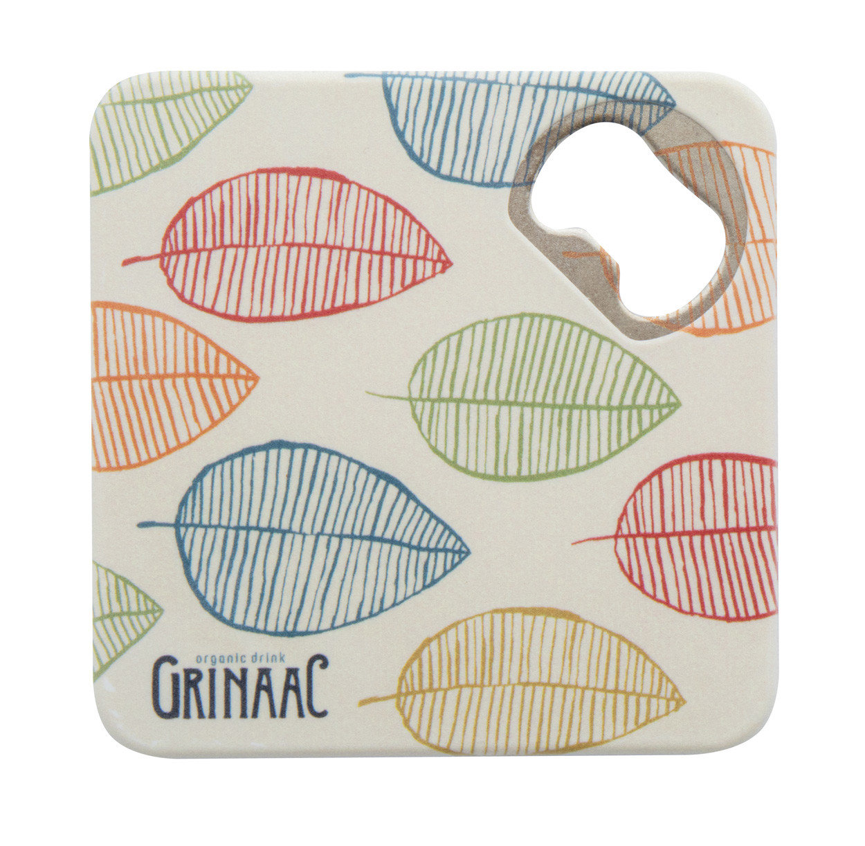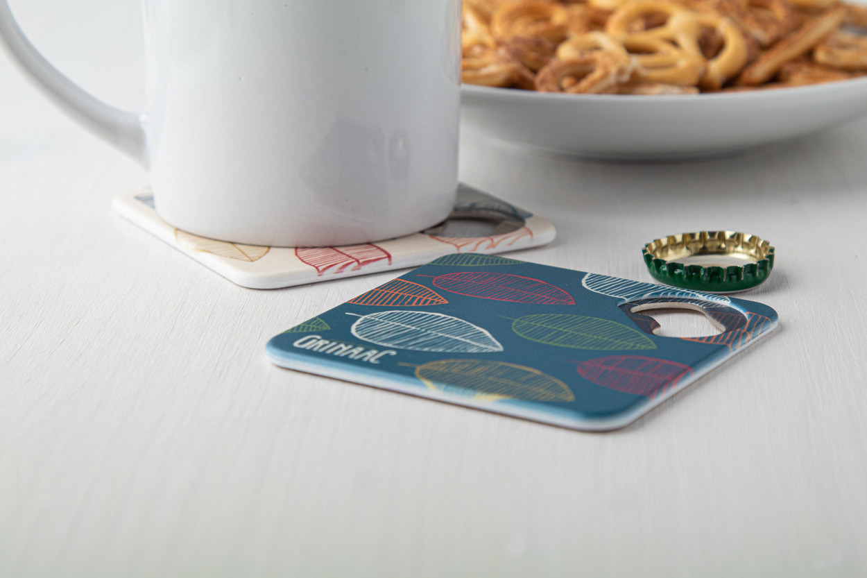 Plastic coaster with metal bottle opener and non-slip bottom.