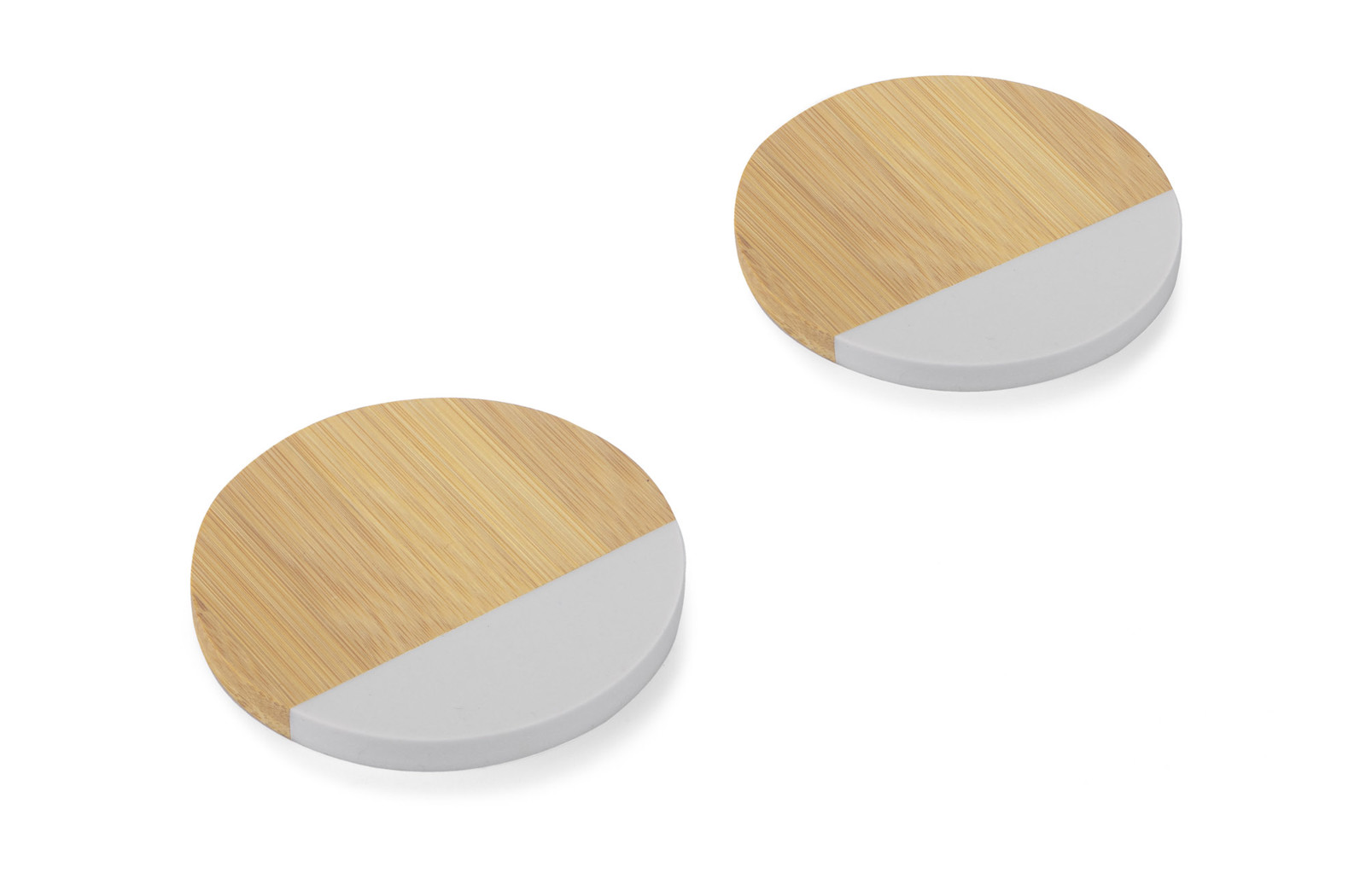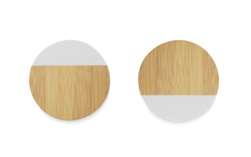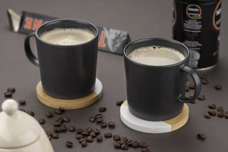 A set of two mug coasters made of a combination of bamboo and artificial marble. The material is durable and resistant to damage. Cosaters look elegant and will certainly fit into many interiors. Packed in a kraft box.