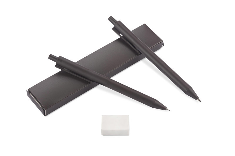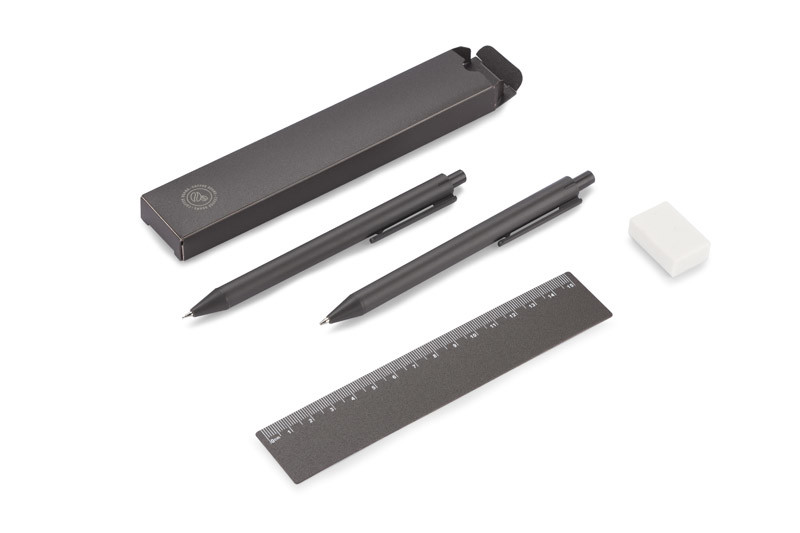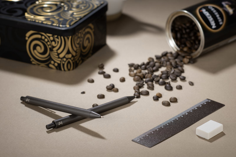 The KOPIKO set consists of a ballpoint pen, automatic pencil and ruler made of plastic containing coffee beans and a classic eraser. Product dimensions: 141 x ⌀ 10 mm (pen); 142 x ⌀ 10 (pencil); 165 x 34 x 13 mm (case), 160 x 30 x 0.6 mm (ruler).