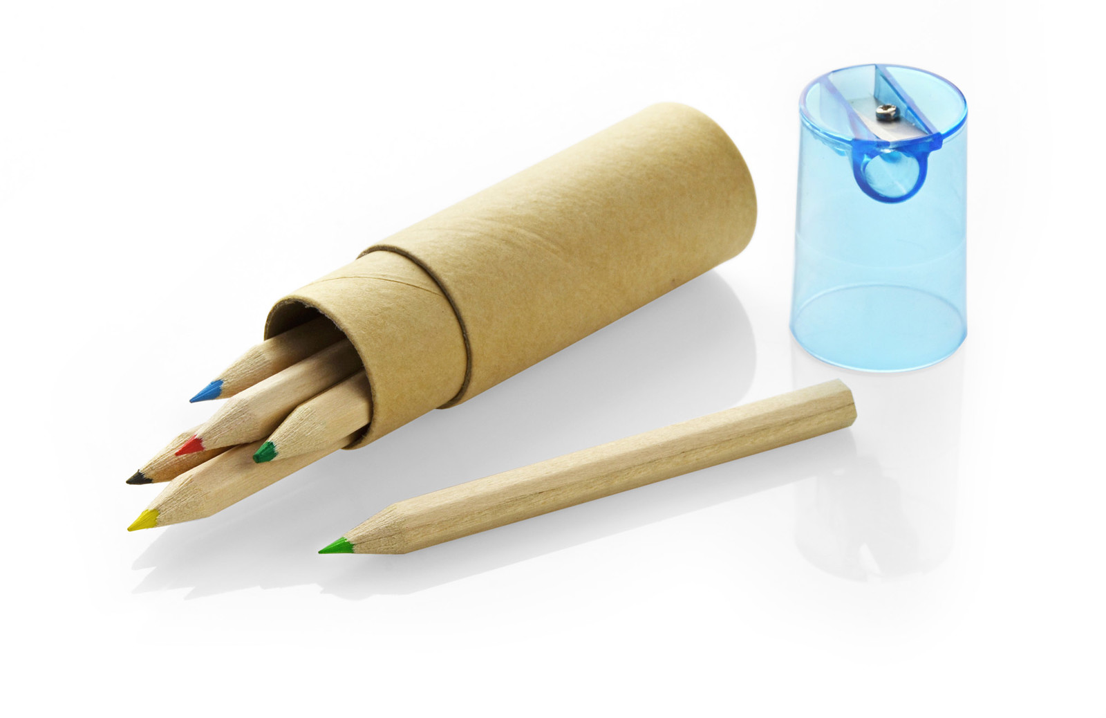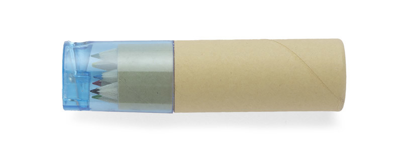 Wooden 6-colour pencils. Packed into a paper tube with plastic closure. There is placed a sharpener in this closure. Logo might be imprinted on the tube.