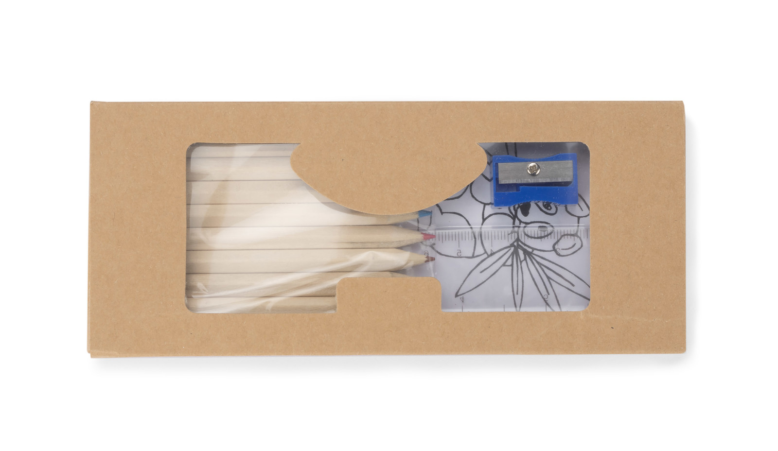 Young artist's set including colouring book, 10 wooden colour pencils, ruler and sharpener. Logo might be imprinted on a carton.
