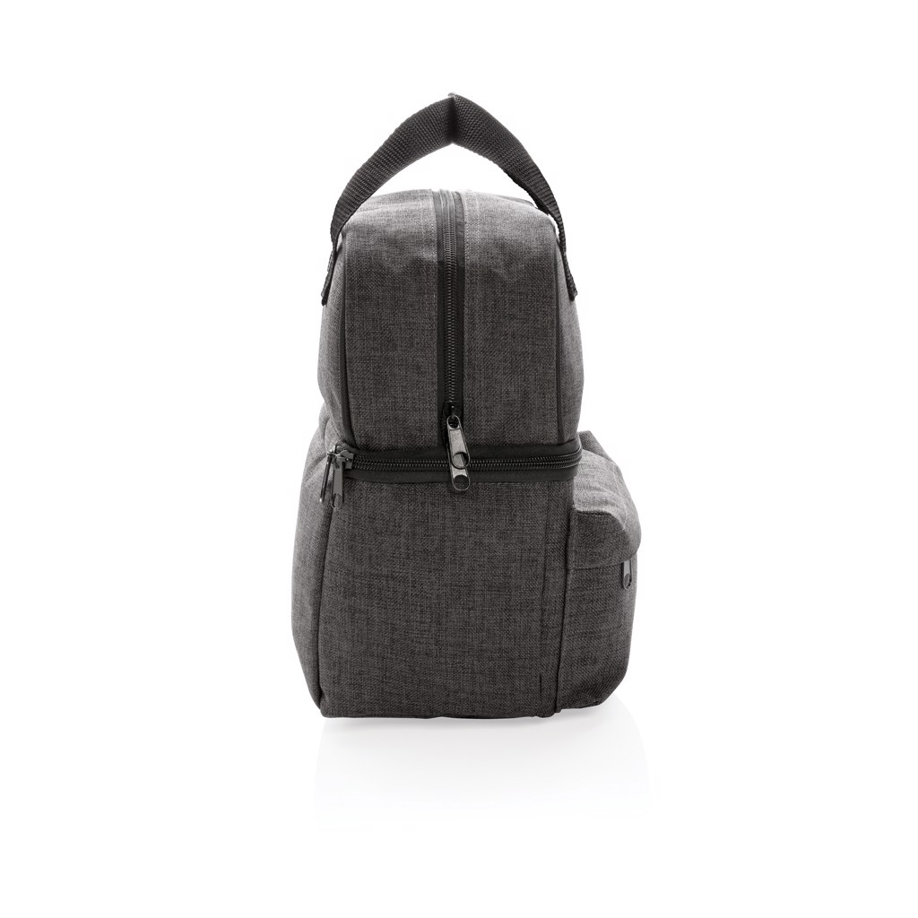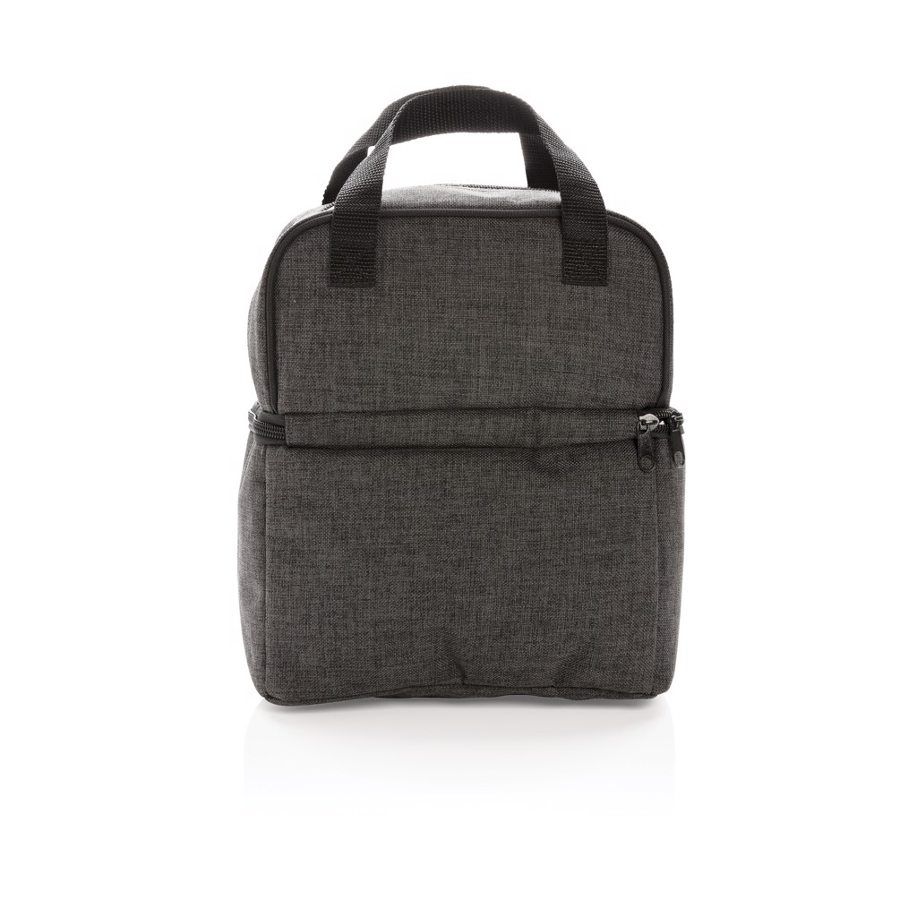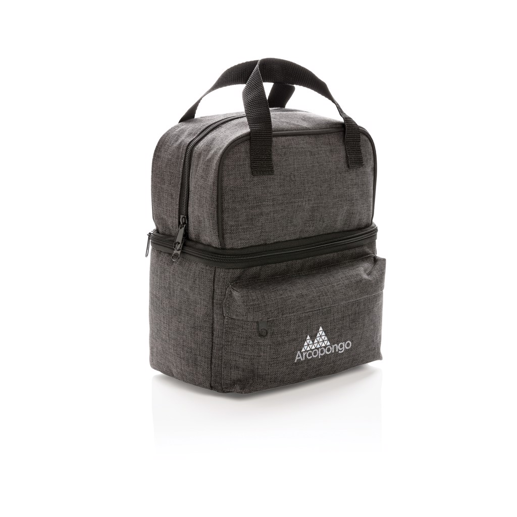 600D polyester cooler with handles and separate compartments. The roomy upper compartment is great for foods like fruit, snacks or cookies. The square bottom compartment is perfect to carry up to 6 cans of drinks. Front zippered pocket is perfect for small accessories such as keys.