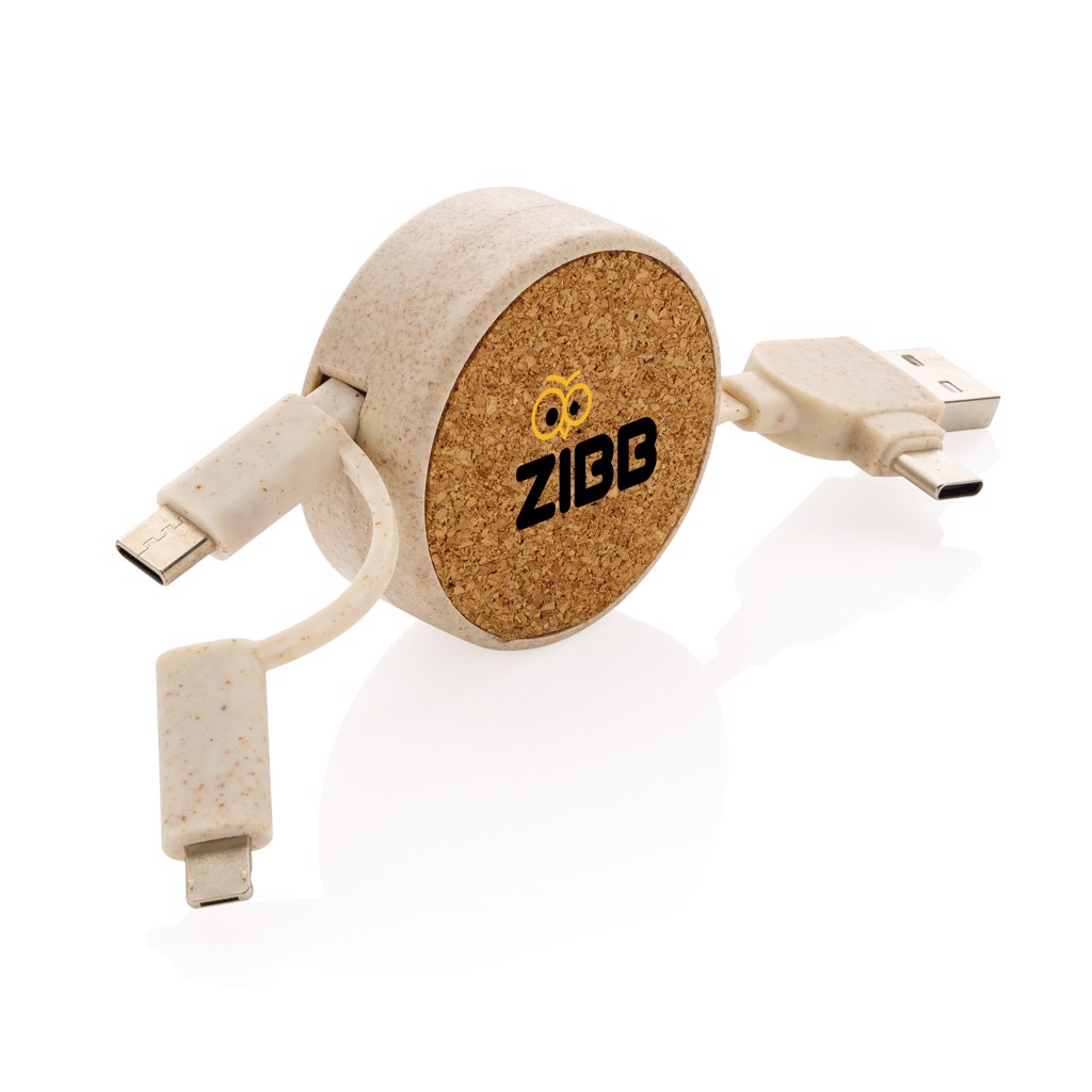 Unique design retractable cable that allows you to charge any type of item from any type of USB source. Made from cork and wheat straw (35%) mixed with ABS and PVC free TPE cable. The cable is perfect for newer generation phone chargers and macbook computers that only have type C output because of the type C input. The cable also has a regular USB A input. Output: type C and double-sided connector for IOS and Android devices. Max cable length: 100 cm. Item 100% PVC free.