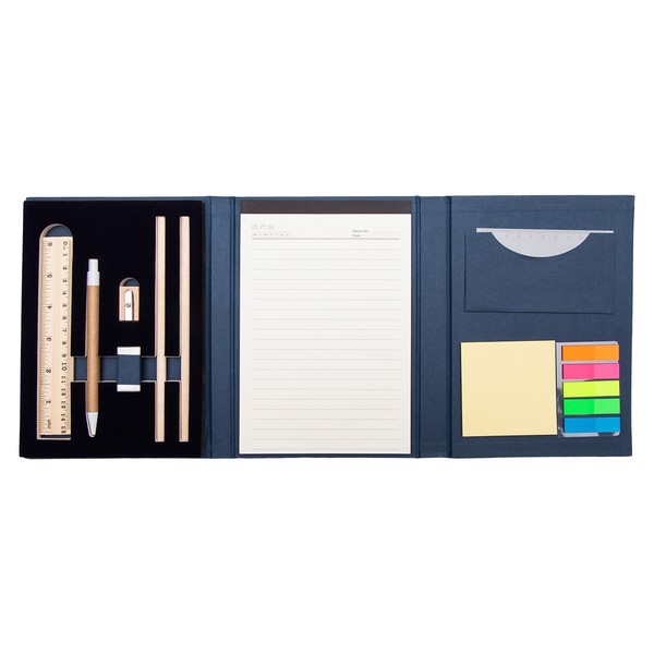 Elegant office set in cardboard cover 1200g/m2. Inside: wooden ruler, ball pen, eraser, sharpener, 2 pencils; 80g/m2 lined paper, 40 sheets, 13,7 x 20,7 cm; yellow sticky paper: 7,5 x 7,5cm, 5 colors sticky PET flags: 1,2 x 4,5 cm, 25 sheets each color; extra pocket with ruler.
