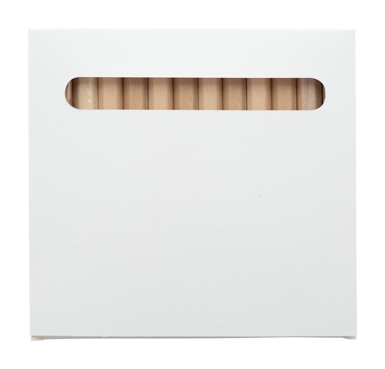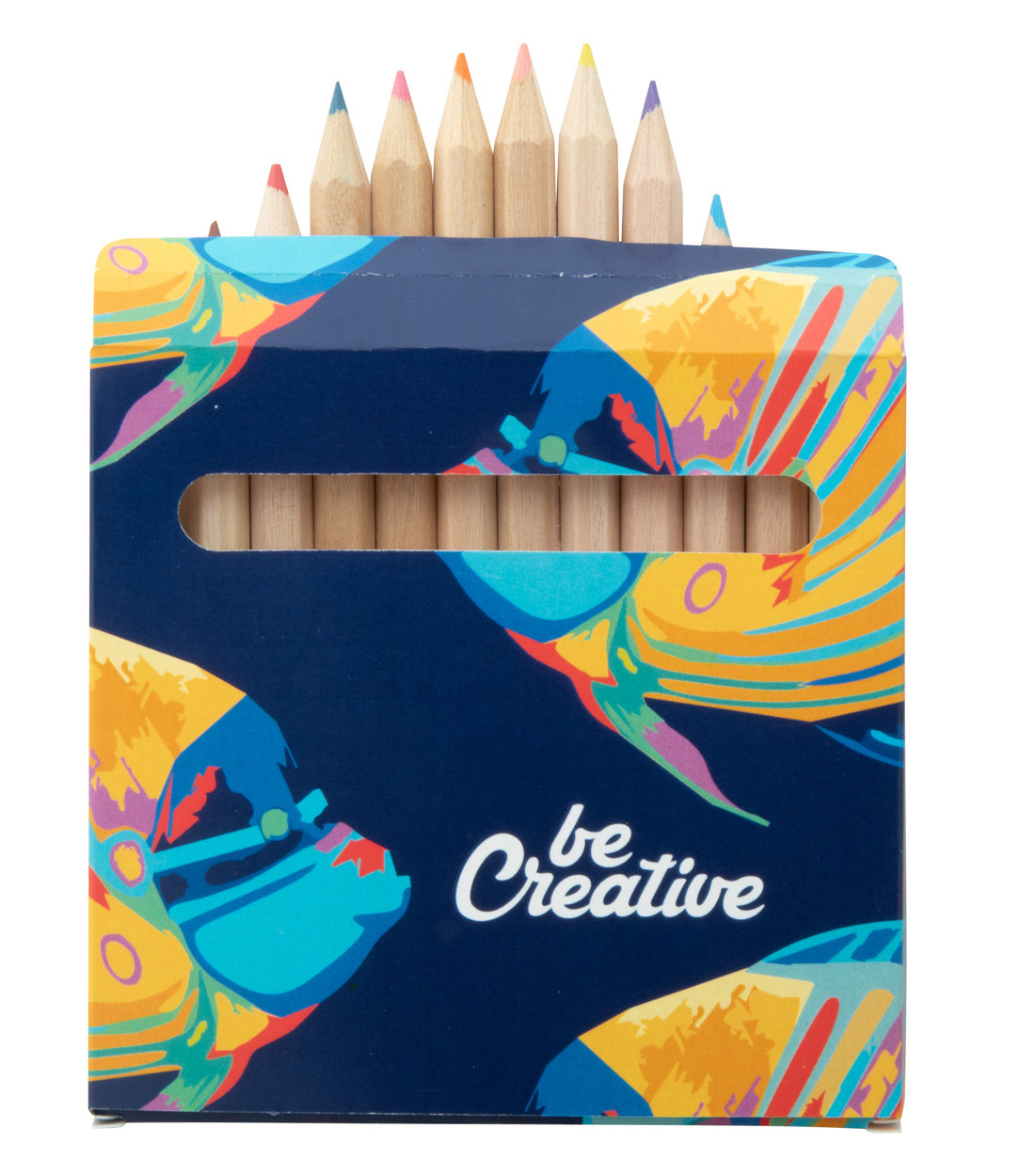 Wooden coloured pencils (12 pcs) in full colour printed paper box. Price includes digital printing. MOQ: 100 pcs.