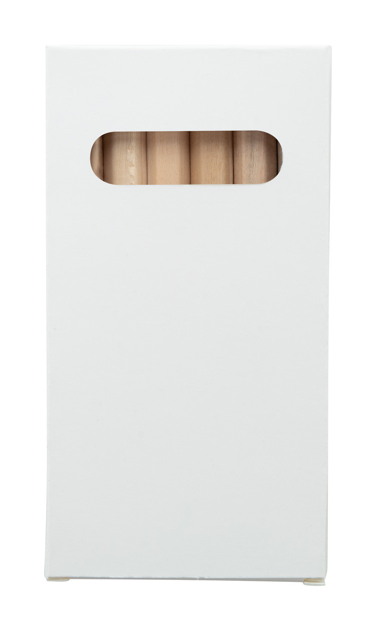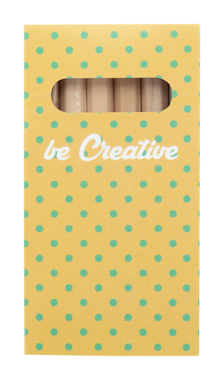 Wooden coloured pencils (6 pcs) in full colour printed paper box. Price includes digital printing. MOQ: 100 pcs.