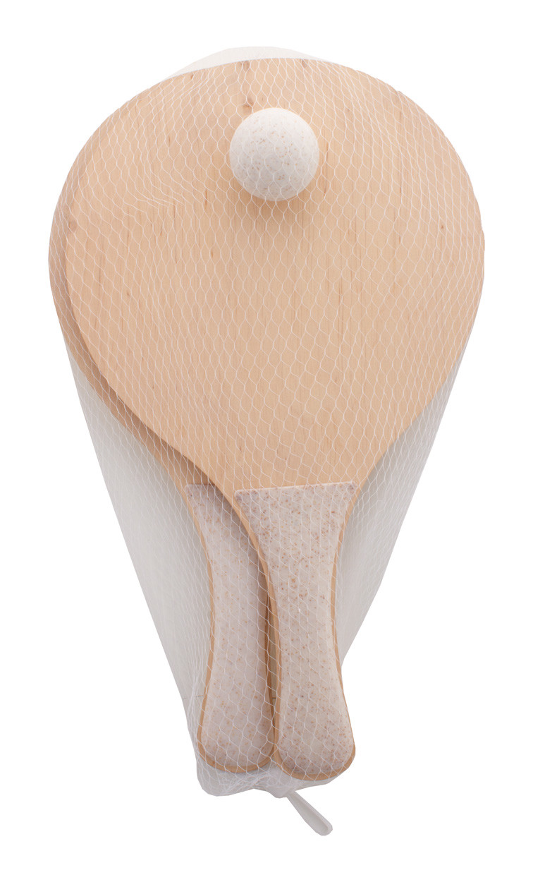 Custom made beach tennis with 2 rackets and one ball. Made of birch plywood and ecological wheat straw plastic. Price includes an identical full colour print on the front side of both rackets. MOQ: 50 pcs.
