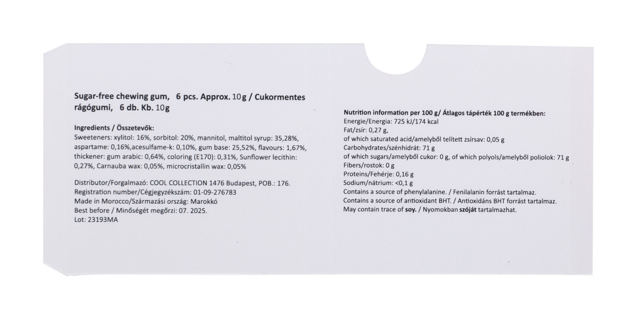 6 pcs sugarfree chewing gum in blister with custom made, full colour printed paper sleeve. MOQ: 100 pcs.