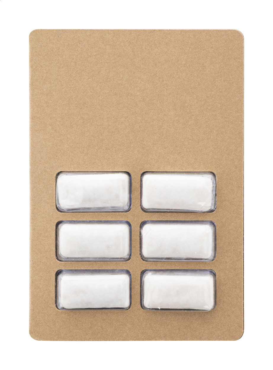 6 pcs sugar free chewing gum in blister with custom made, full colour printed perforated kraft paper sleeve. MOQ: 100 pcs.