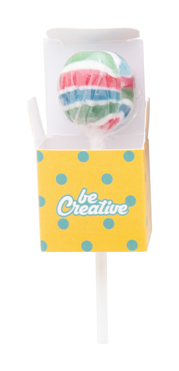 Multi-fruit flavour lollipop (8 g) in custom made, full colour printed paper box. MOQ: 100 pcs.