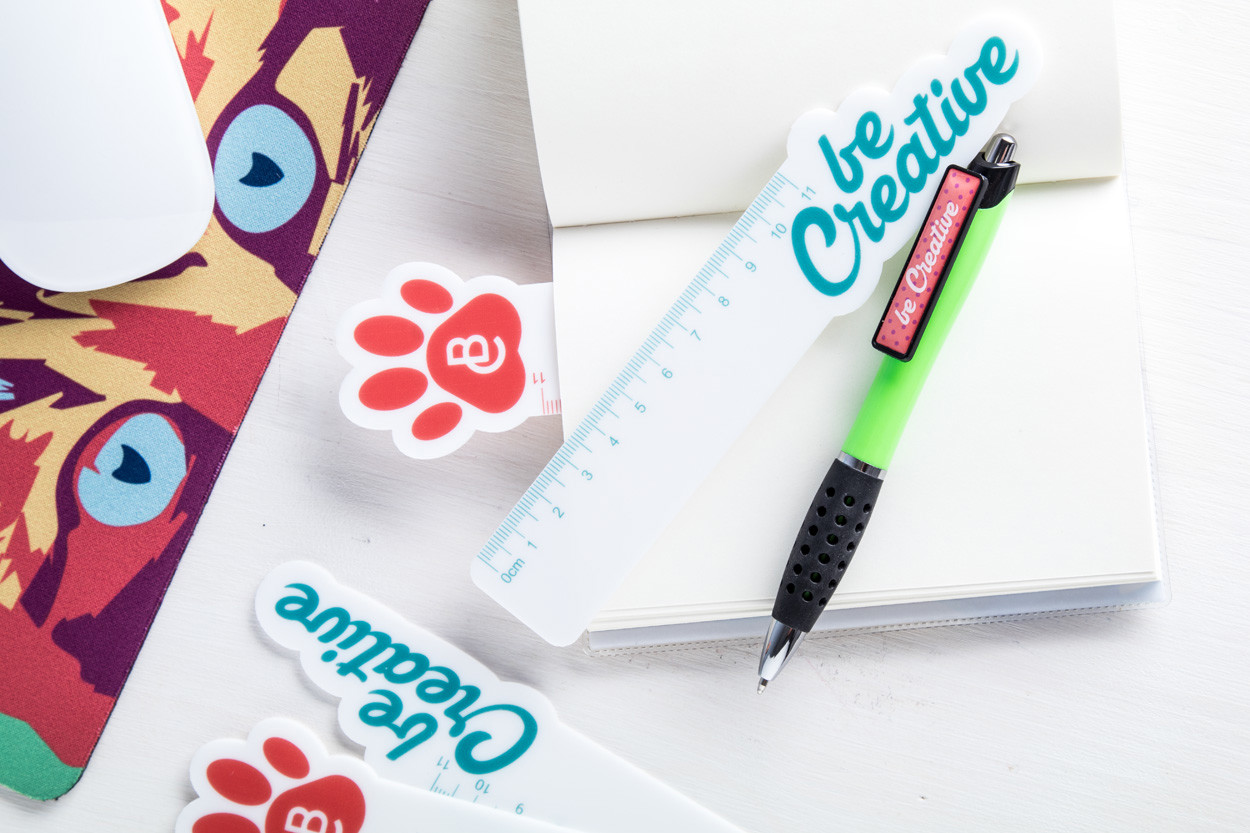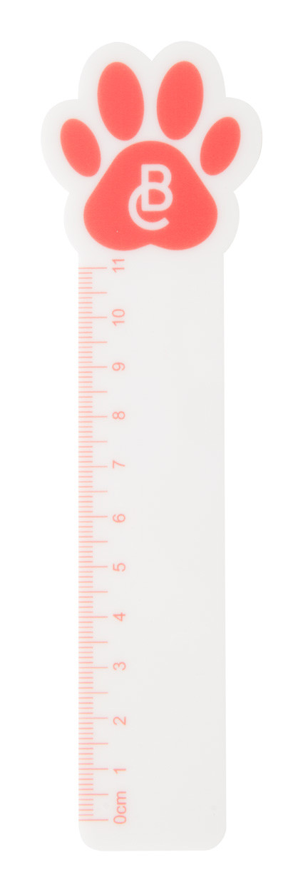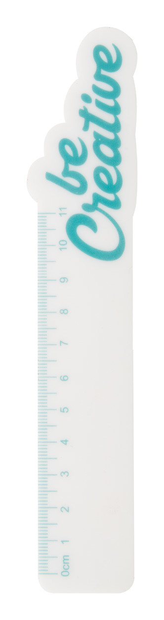 Custom made, plastic ruler (11 cm) with custom shaped top part (maximum size: 50x50 mm). Price includes 1 colour printing. MOQ: 100 pcs.