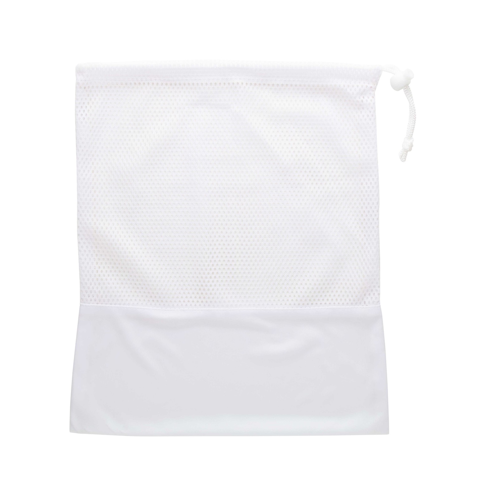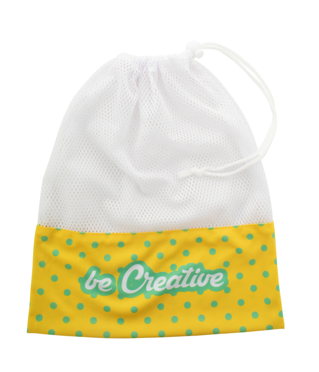 Custom made polyester produce bag with mesh upper section and drawstring closure. With sublimation printed graphics on lower fabric part. MOQ: 50 pcs.