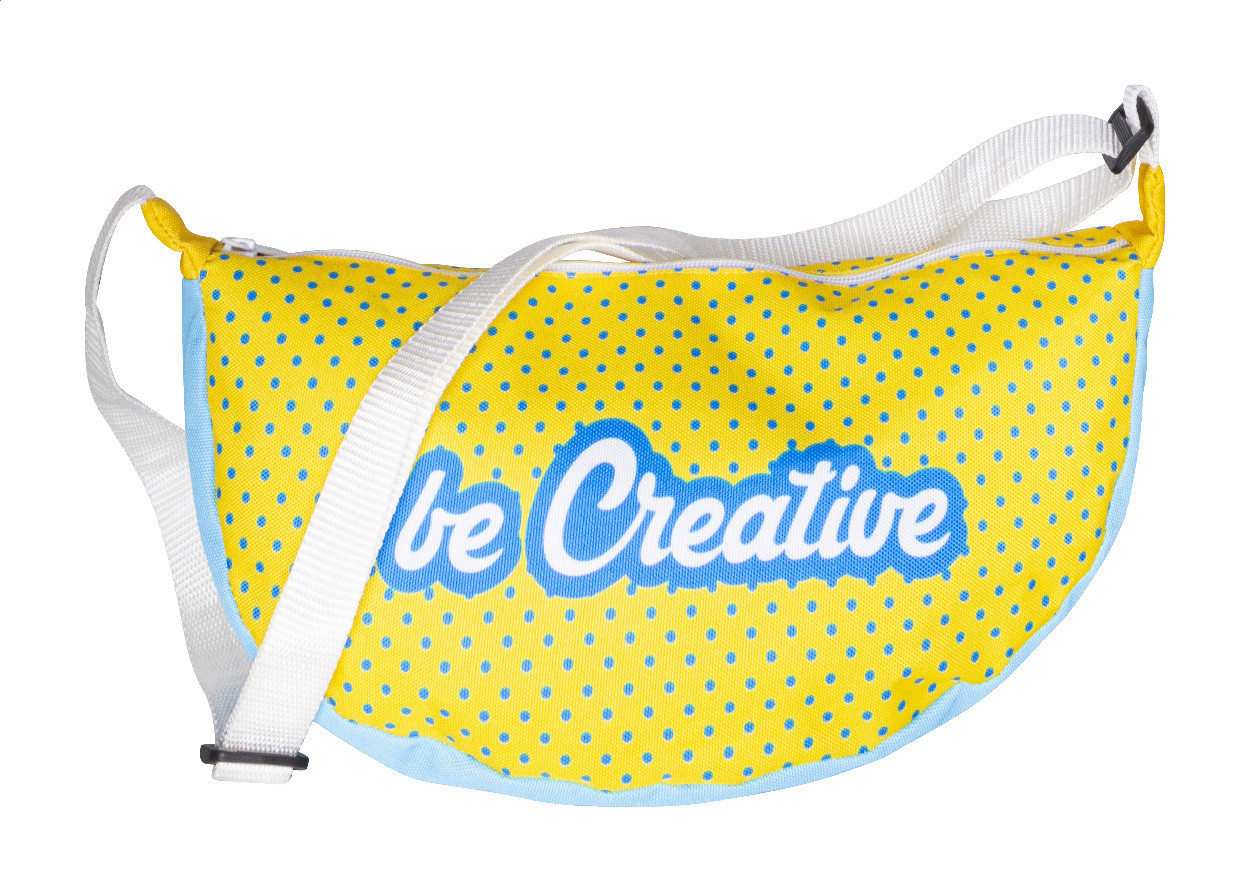Custom made, crossbody shoulder bag in 600D RPET polyester with adjustable strap and zipped compartment. With all over sublimation printed graphics and distinctive RPET label. MOQ: 25 pcs.