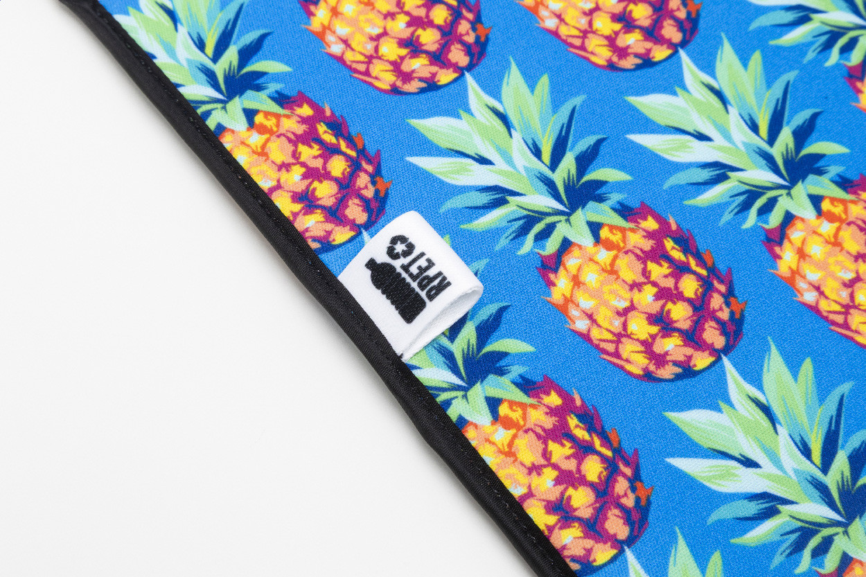 Custom made, RPET neoprene document bag or laptop pouch with all over sublimation printed graphics. Fits laptops up to 15". MOQ: 25 pcs.