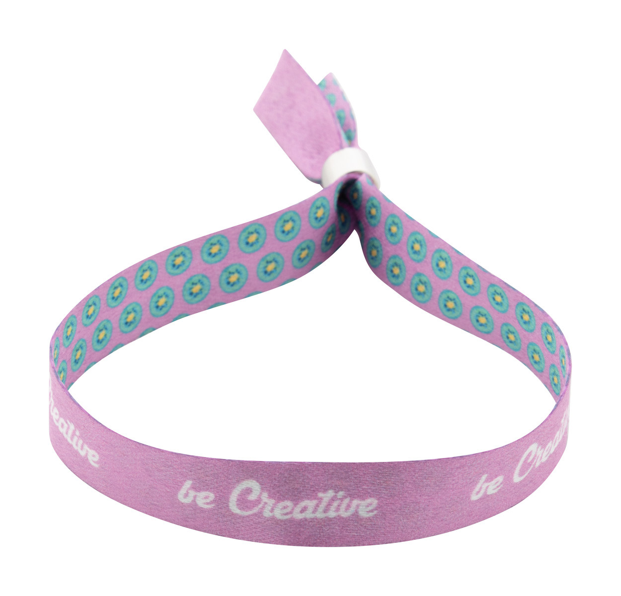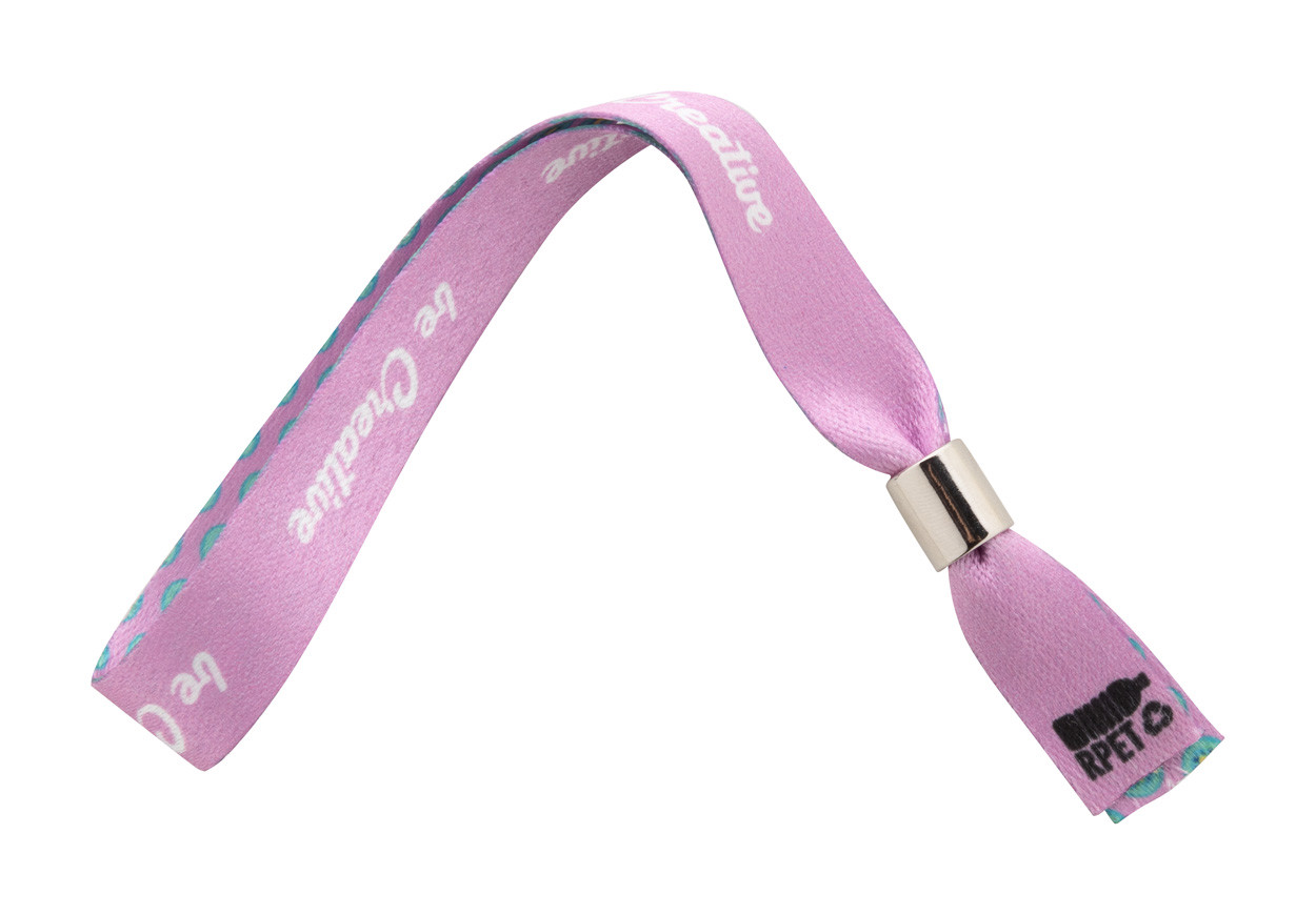 Custom made, RPET polyester festival bracelet with metal safety lock. With sublimation printed graphics on both sides. MOQ: 100 pcs.