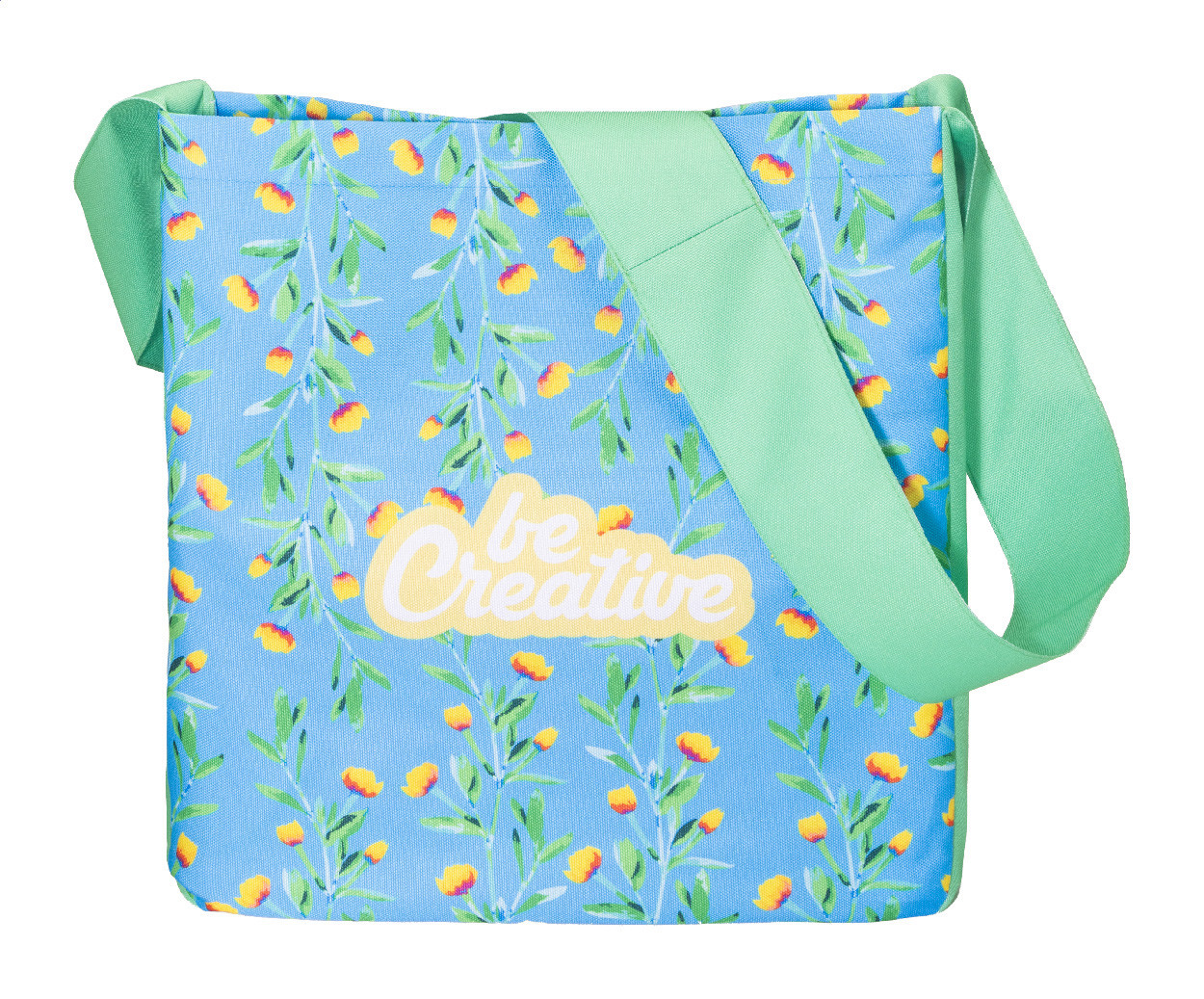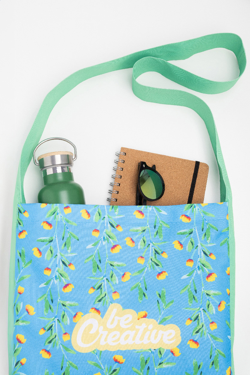 Custom made, shoulder bag in 600D RPET polyester with long shoulder strap and button closure. With all over sublimation printed graphics and distinctive RPET label. MOQ: 25 pcs.