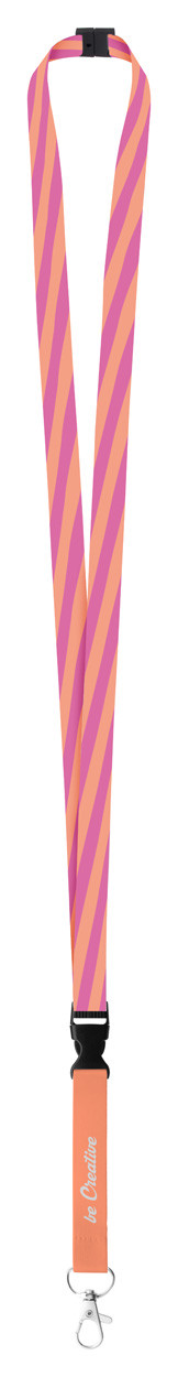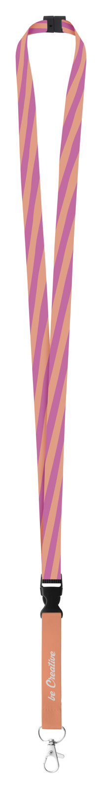 Custom made, 15 mm wide polyester lanyard with detachable metal carabiner and safety buckle. With sublimation printed graphics on both sides. MOQ: 100 pcs.