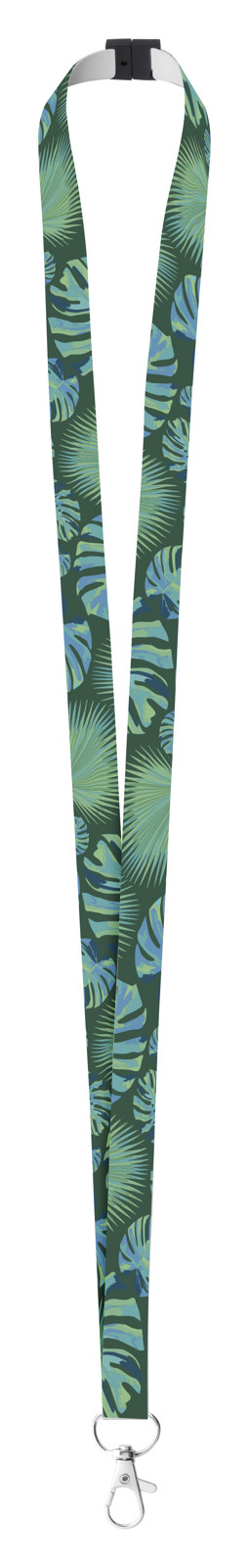 Custom made, 15 mm wide polyester lanyard with metal carabiner and safety buckle. With sublimation printed graphics on one side. MOQ: 100 pcs.