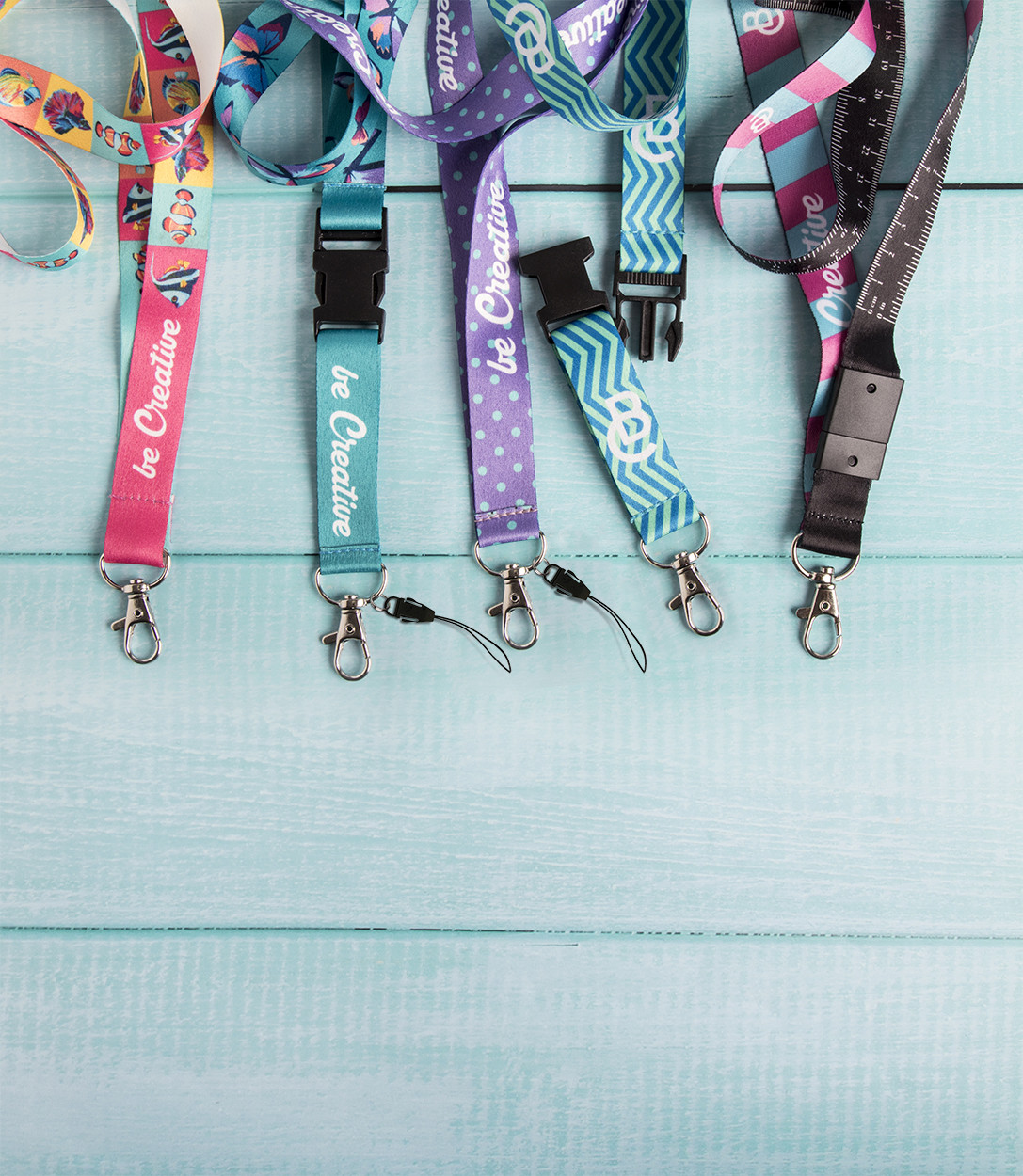 Custom made, polyester lanyard with metal carabiner and mobile string. With sublimation printed graphics on both sides. MOQ: 100 pcs.