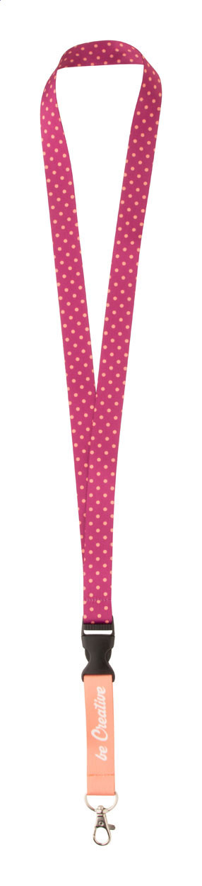 Custom made, polyester lanyard with detachable metal carabiner. With sublimation printed graphics on both sides. MOQ: 100 pcs.