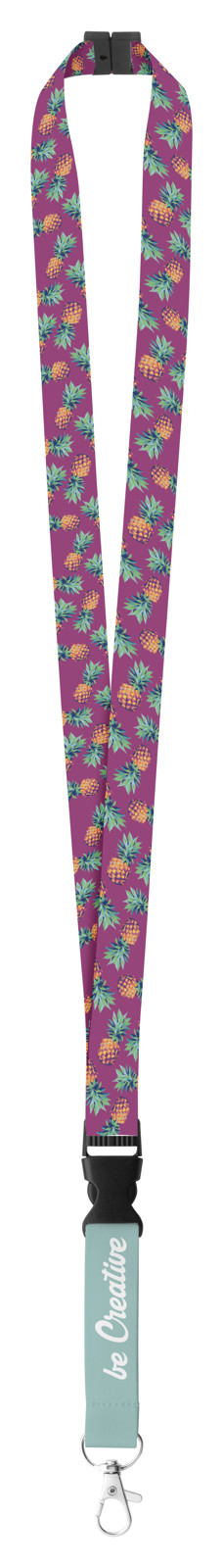Custom made, polyester lanyard with detachable metal carabiner and safety buckle. With sublimation printed graphics on both sides. MOQ: 100 pcs.