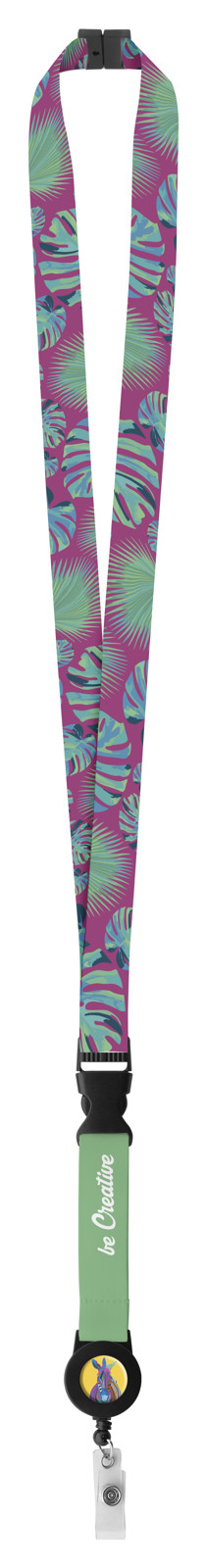 Custom made, polyester lanyard with detachable telescopic badge holder and safety buckle. With sublimation printed graphics on both sides. MOQ: 100 pcs.